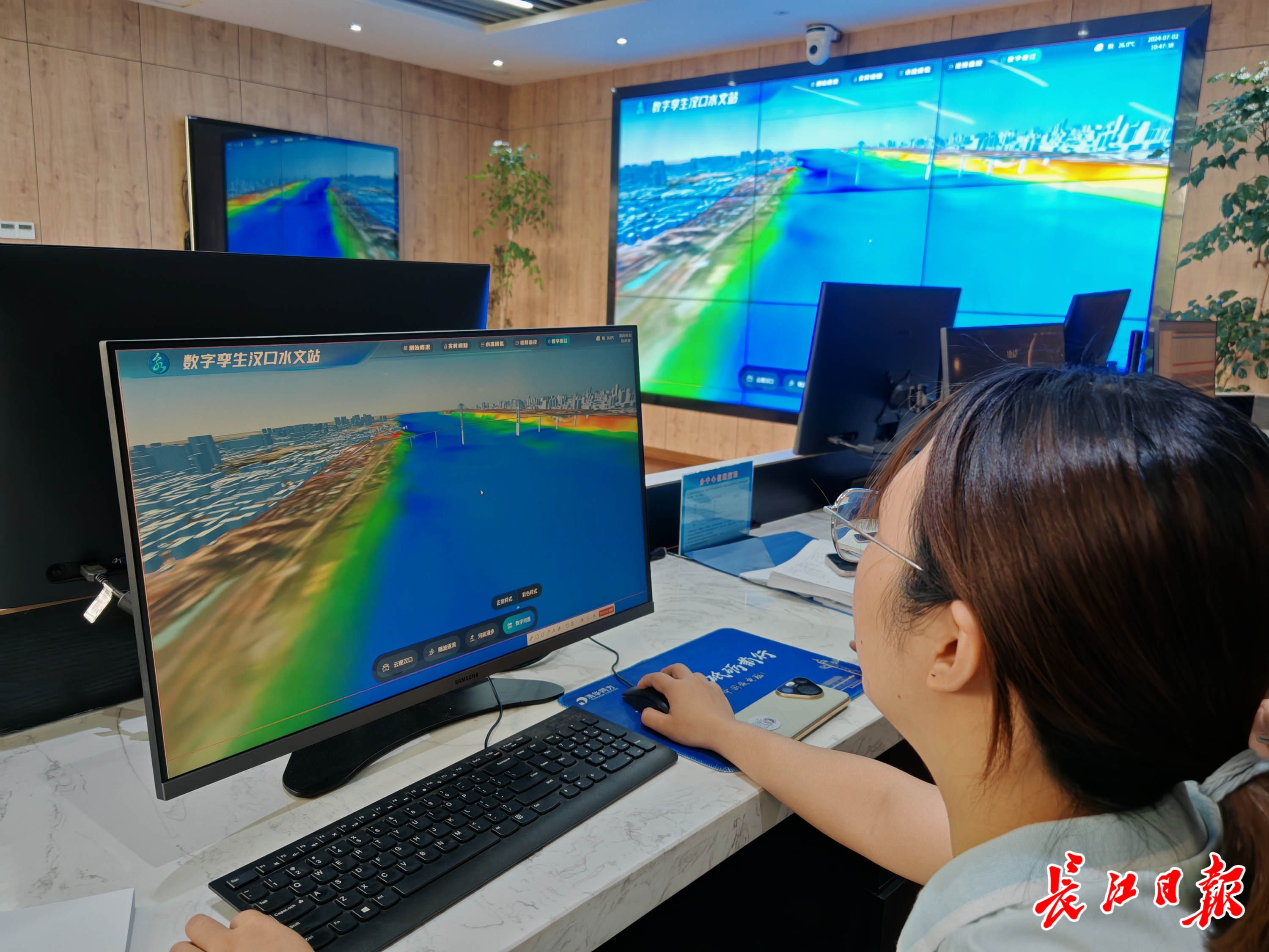 在汉口水文站二楼水情分中心大屏上,一条数字孪生长江正在缓缓流动,不同色带清晰显示着水位变化,水质、流量、泥沙等各类实时感知数据。