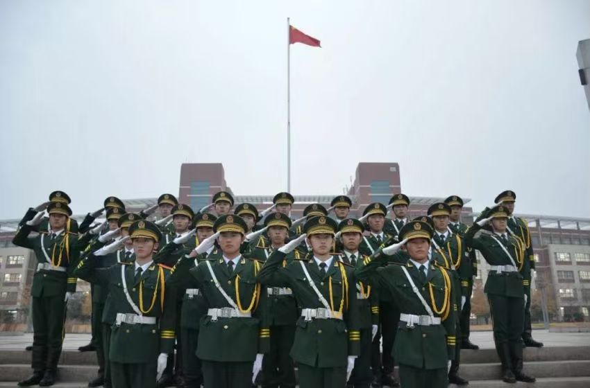 经过严格筛选,我如愿加入了学校国旗护卫队,成了队伍里的刀卫,接过沉甸甸的仪仗指挥刀,也开启了我的护旗之路。在学校的泰山广场,日常的训练一丝不苟。日常执勤时,从宿舍到泰山广场的路上,经常因为时间太早空无一人,但我们仍然按照正式升旗的规范完成所有操作。宿舍的衣柜也有一块专属区域,每次训练结束,我们都将制服整整齐齐挂在衣柜里,因为我们内心都对国旗有着无限虔诚。