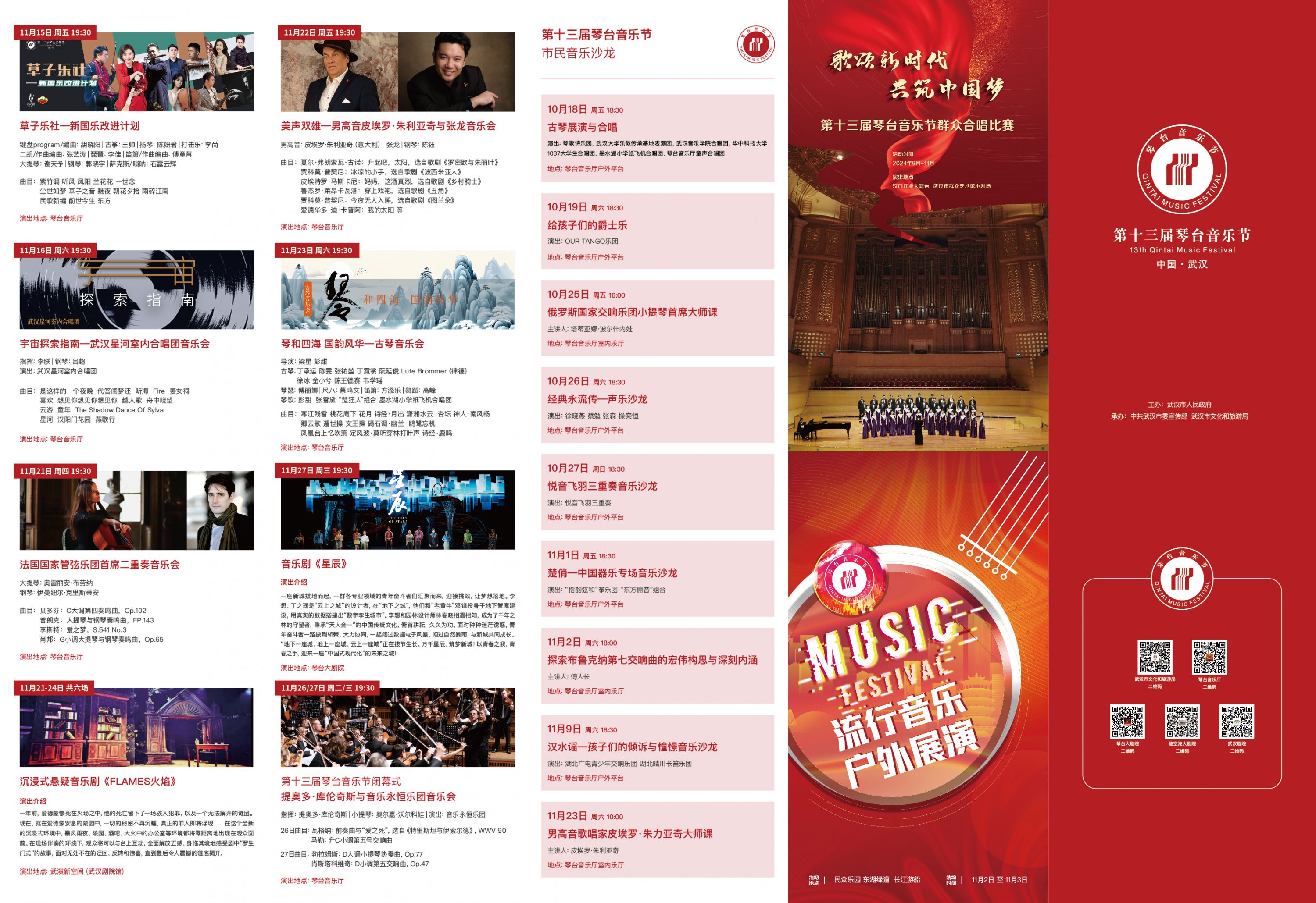 二是举办古琴系列活动、群众合唱比赛、流行音乐展演等群众音乐活动近20场。古琴系列活动以“琴和四海·国韵风华”为主题,由著名古琴艺术家丁承运举办古琴专场音乐会,同时将在武汉三镇地标级商圈开展3场快闪活动。流行音乐展演以“潮流音浪 都市乐章”为主题,邀请武汉国际友城乐队,上海、南京、重庆等长江流域城市流行乐队以及本地优秀流行乐队进行10场展演。深受群众欢迎的合唱比赛以“歌颂新时代·共筑中国梦”为主题,将通过初选和复赛遴选出武汉都市圈优秀合唱团队进行决赛,用歌声向中华人民共和国75周年华诞献礼。