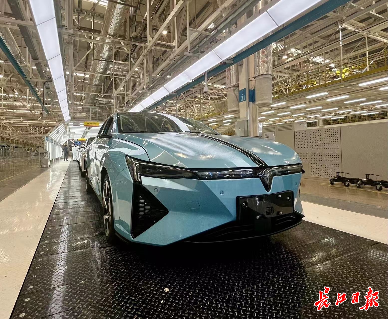 走进总装车间和焊装车间,长江日报记者眼前呈现一片繁忙景象:冲压、焊接、涂装、总装等一系列工序的机器设备严阵以待,数百只黄色机械臂在零部件上翩翩起舞,上百台机器人与AGV智能物流小车在工位之间来回穿梭。智能化的流水线上,车辆依次经过底盘、电池包、轮胎等装配环节,最终完成组装。