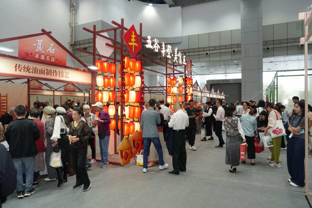 本次活动既是一次非遗技艺和非遗创新产品的展示,也是一个连接非遗传承人与广大消费者的平台。其中,非遗烟火气,最抚凡人心,人气最高的非“五谷丰登”展区莫属。姜桥的芋头圆子、鄂州的鱼丸、荆门的腊香鸡、谢埠的千张等手工制作美食半天时间就销售过半;扬子江的传统糕点、黄石阳新的油面、孝感的糊汤米酒、枣阳的酸浆面等美食都需要排队品尝和购买。