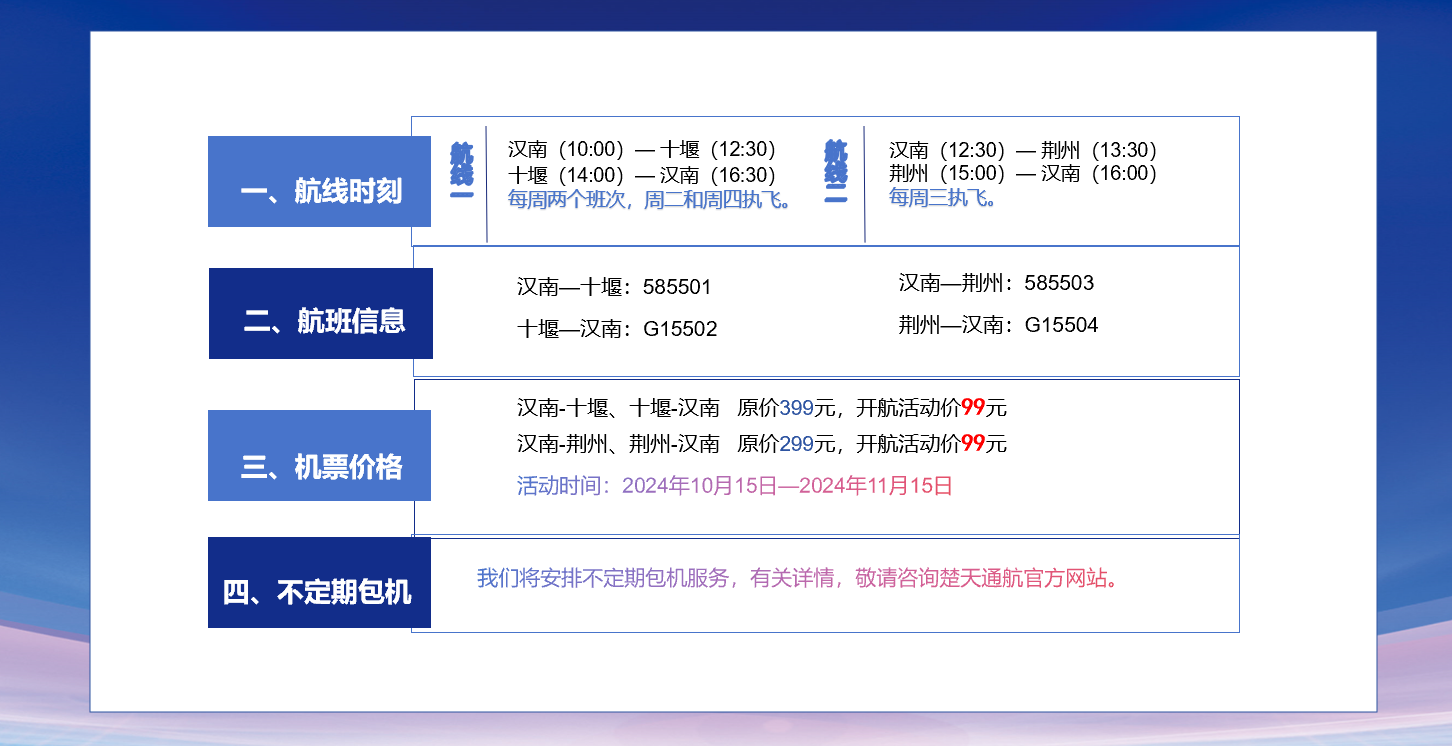目前,汉南往返十堰机票已经开售,原价399元,开航活动价99元;汉南往返荆州机票预计下周开售,原价299元,开航活动价99元,活动时间至11月15日。