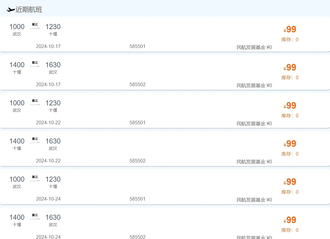 记者点开武汉汉南机场公众号查看,点击左下角“航班售票”,可清楚地看到武汉往返十堰、荆州的航班号、航班时刻以及票价。点击航班搜索,结果显示,截至当天14时10分,一个月内武汉至十堰的优惠机票仅11月5日库存2张、11月14日库存3张,其余时间段库存均显示为“0”。