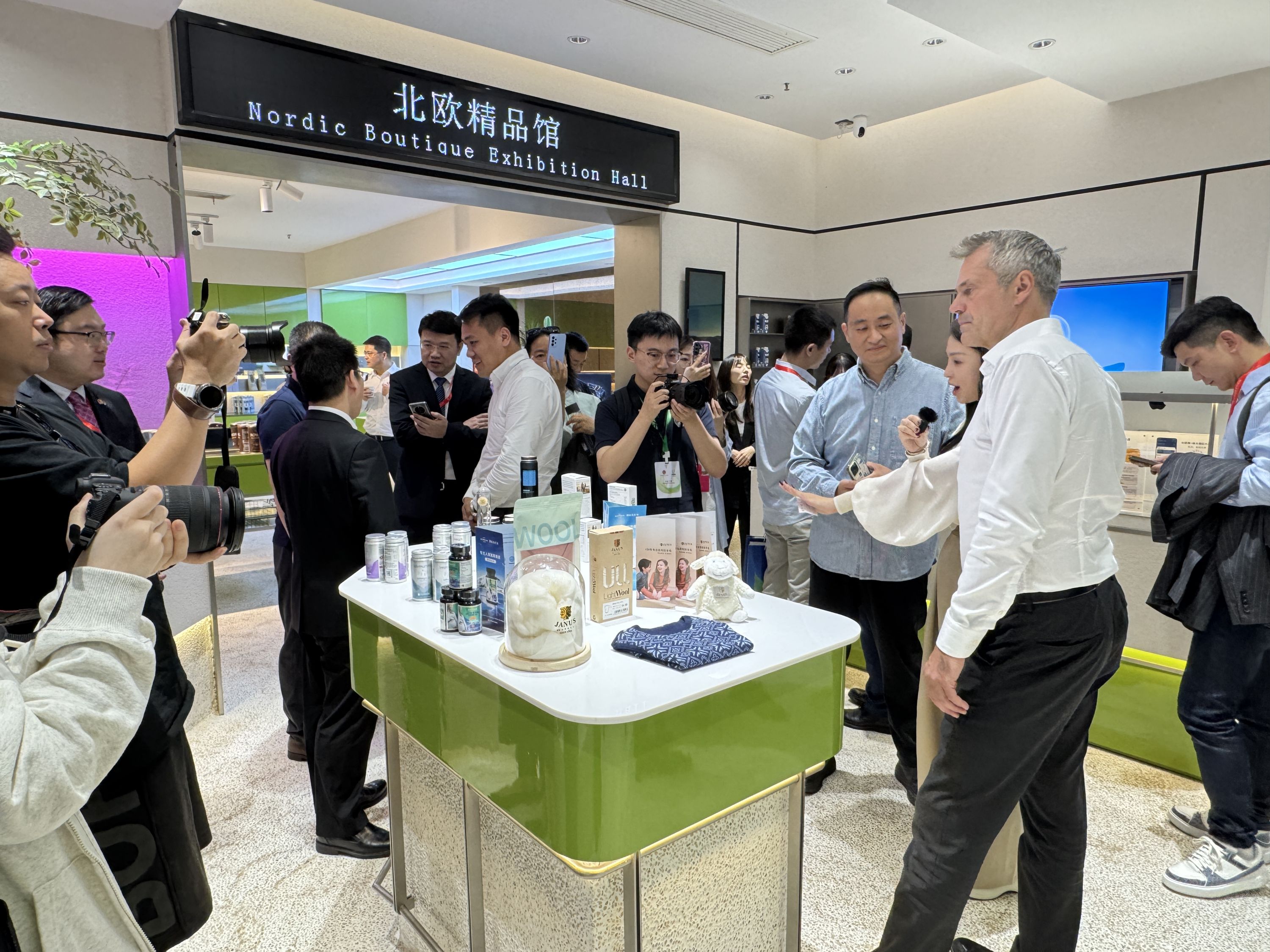 10月18日,2024中国—北欧经贸合作论坛上举行了北欧精品馆开馆仪式。馆内汇聚丹尼诗皇冠丹麦曲奇、哥本哈根经典金酒等80多种来自北欧的优质商品。图为国内外企业家在馆内了解相关产品。