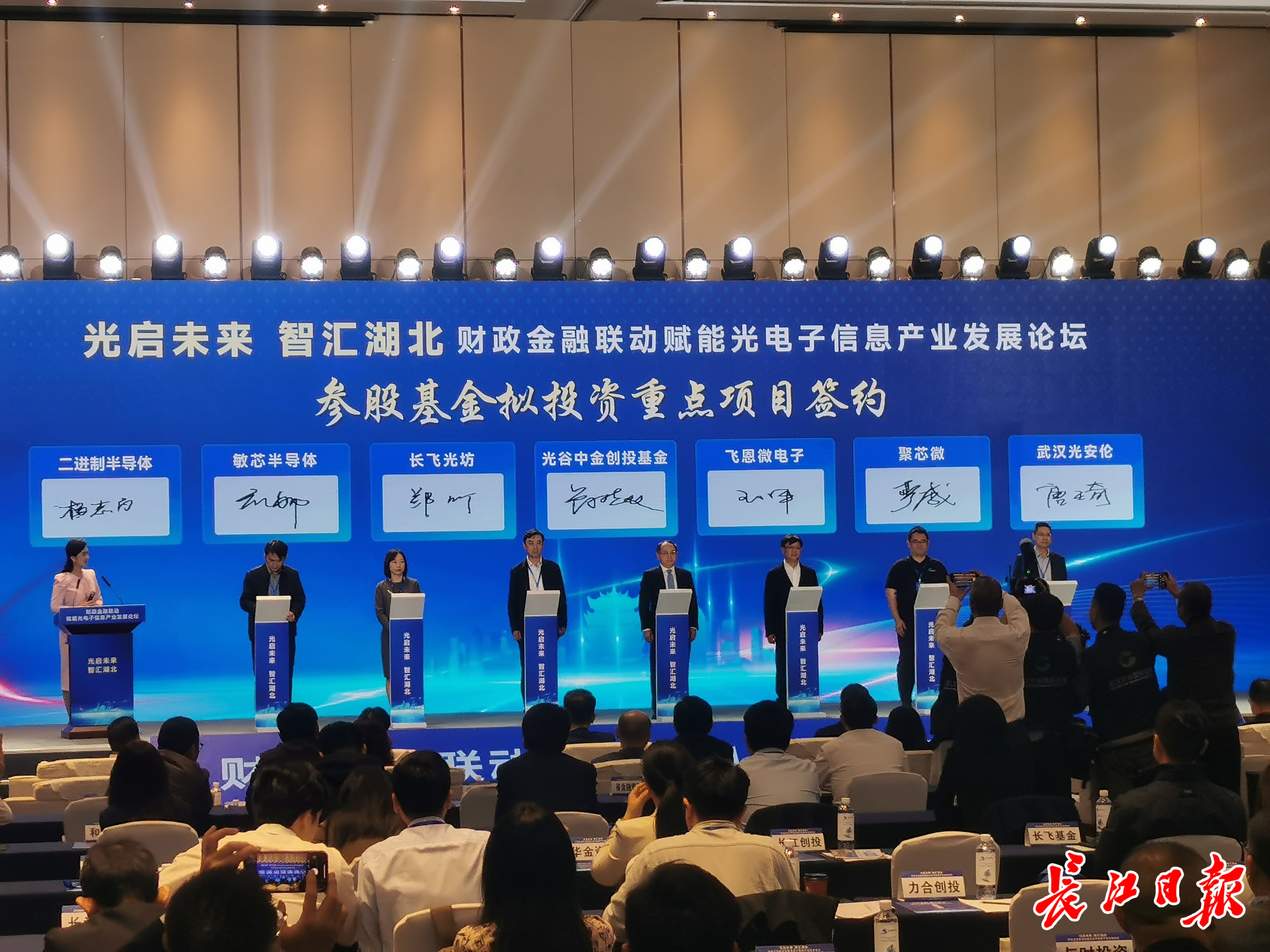 论坛上,还举行了省政府投资引导基金与重点合作基金等签约,参加论坛的业界“大咖”发表了深度行业报告,相关部门进行了政策宣讲。路演环节,长飞先进、聚芯微、飞恩微电子、武汉光安伦、二进制半导体等5家业界领军企业作行业动态分享及融资推介。