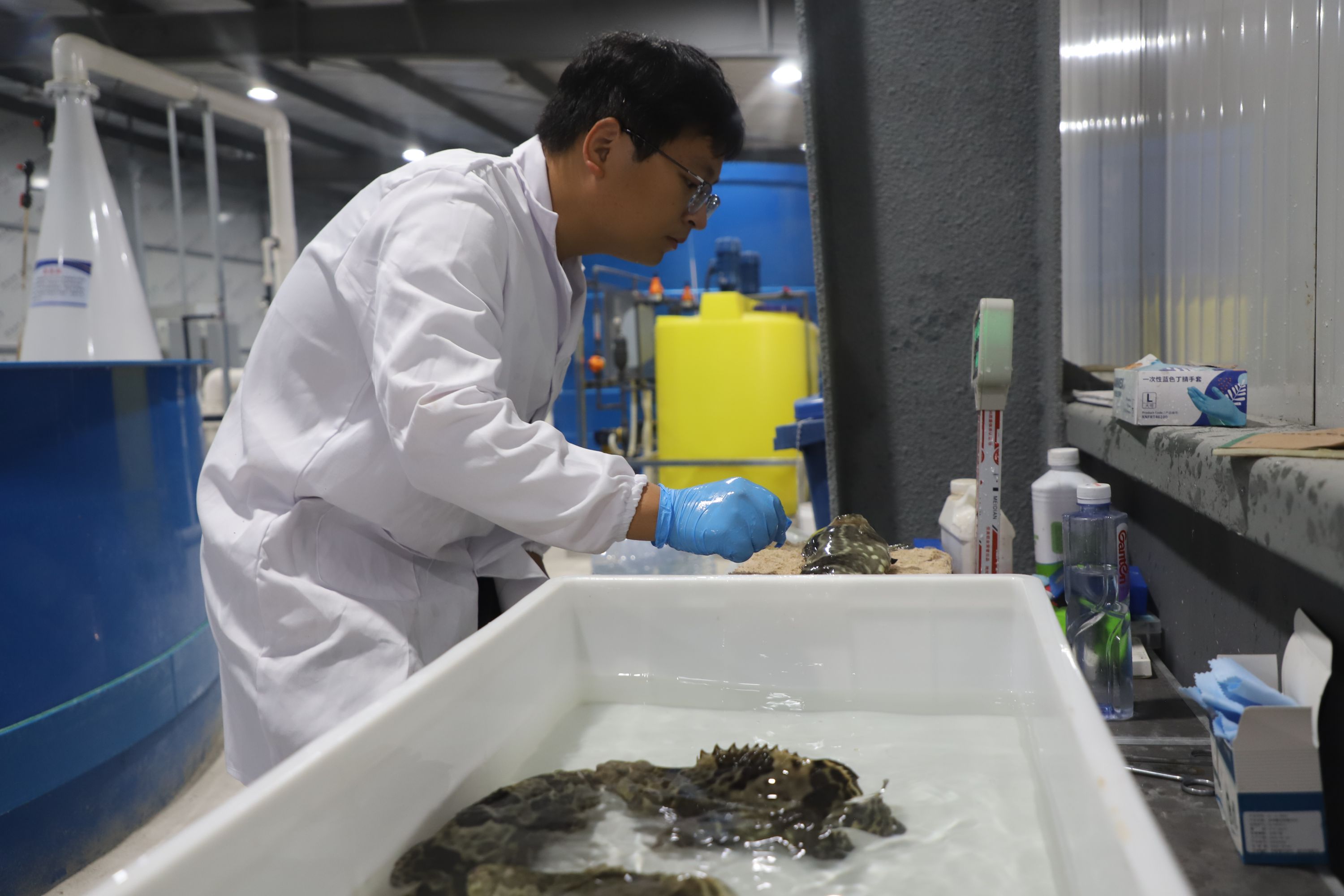 陈庆毕业于华中农业大学水产养殖学专业,硕士研究生毕业后直接来到青鱼原种场负责石斑鱼的养殖技术。他每天的工作很充实,包括记录水温、溶氧、盐度、pH和氨氮等水质指标,及时调整运行参数,确保水环境的正常;对石斑鱼进行科学投喂,观察摄食,测量生长数据,预测生长趋势;优化养殖设备管理、做好鱼病防治措施,提高存活率。