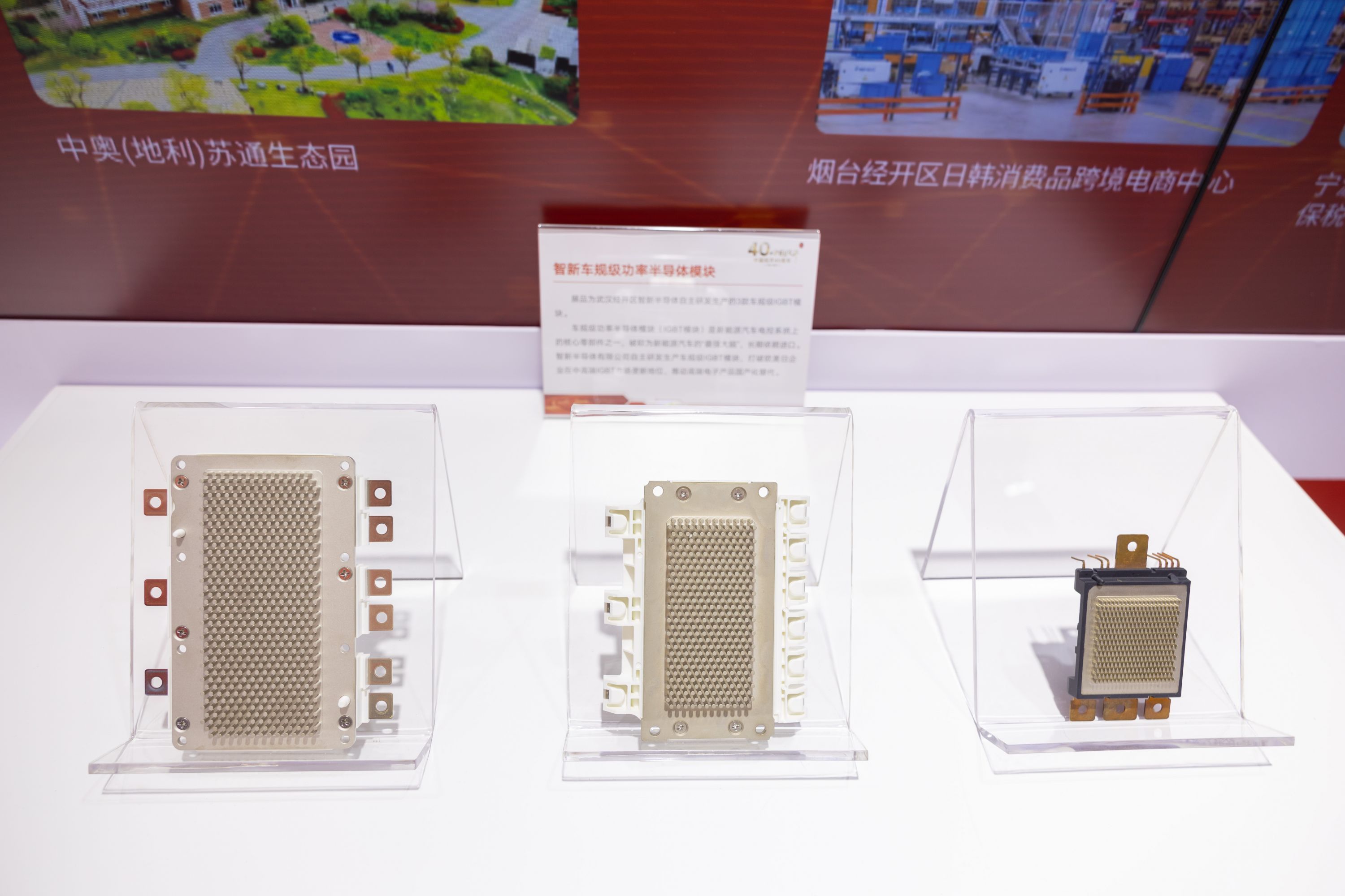 讲解员介绍,作为新能源汽车的“最强大脑”的车规级功率半导体模块,武汉企业智新半导体,打破欧美日企业在车规级功率半导体模块中高端市场垄断地位。