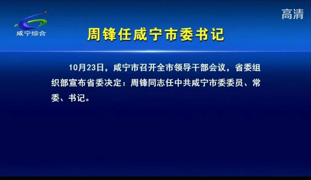 10月23日晚间,咸宁电视台综合频道的报道显示,省委组织部相关领导在当天召开的咸宁全市领导干部会议上,宣布了省委关于周锋同志担任咸宁市委书记的决定。