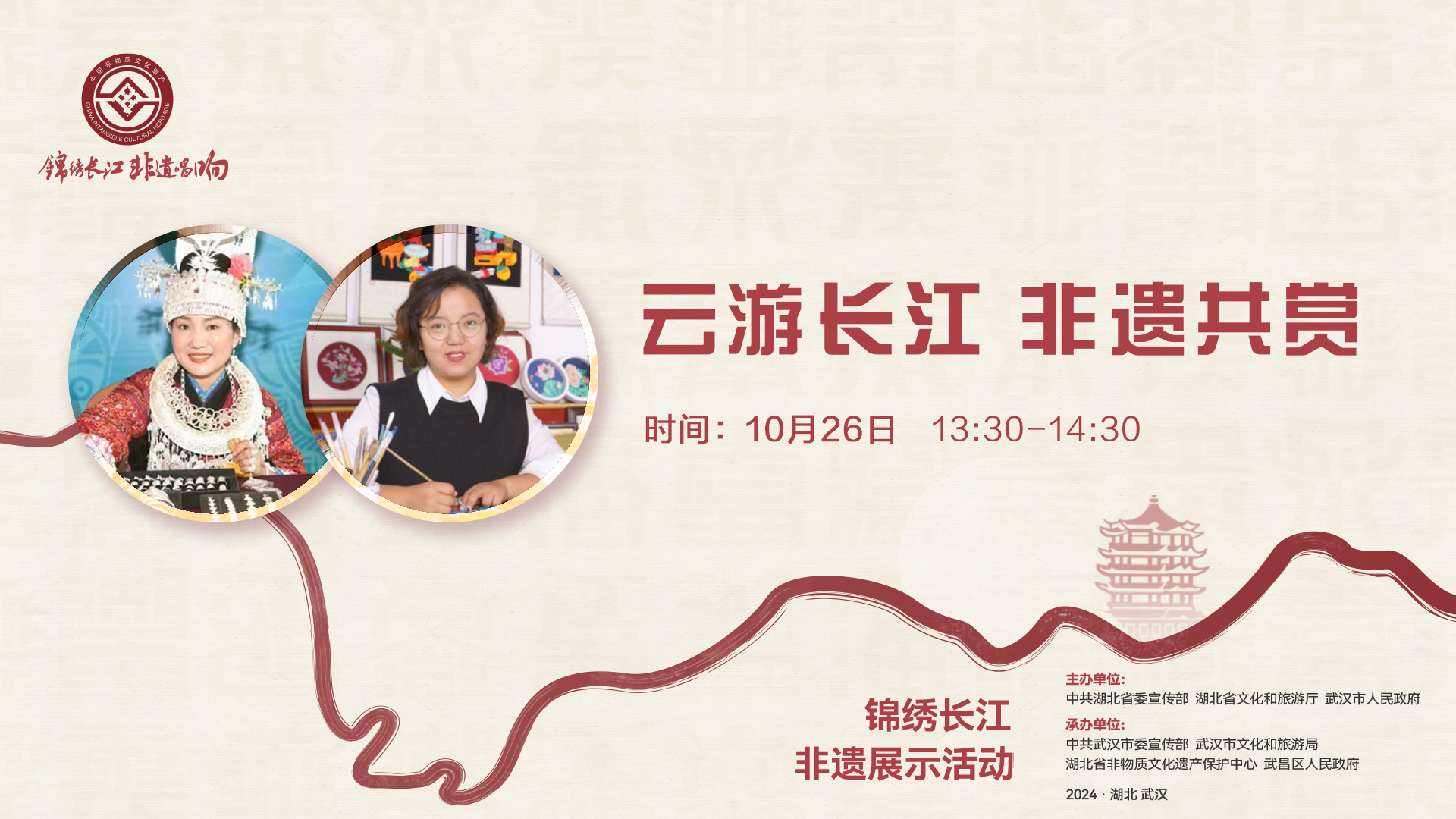 长江日报大武汉客户端10月25日讯(记者黄丽娟)云游长江,非遗共赏。10月26日,“锦绣长江”非遗展示活动精彩延续,长江日报大武汉客户端直播间再度邀请5位来自长江流域多省份的非遗传承人来到现场,分享他们与其热爱的非遗技艺之间的动人故事。
