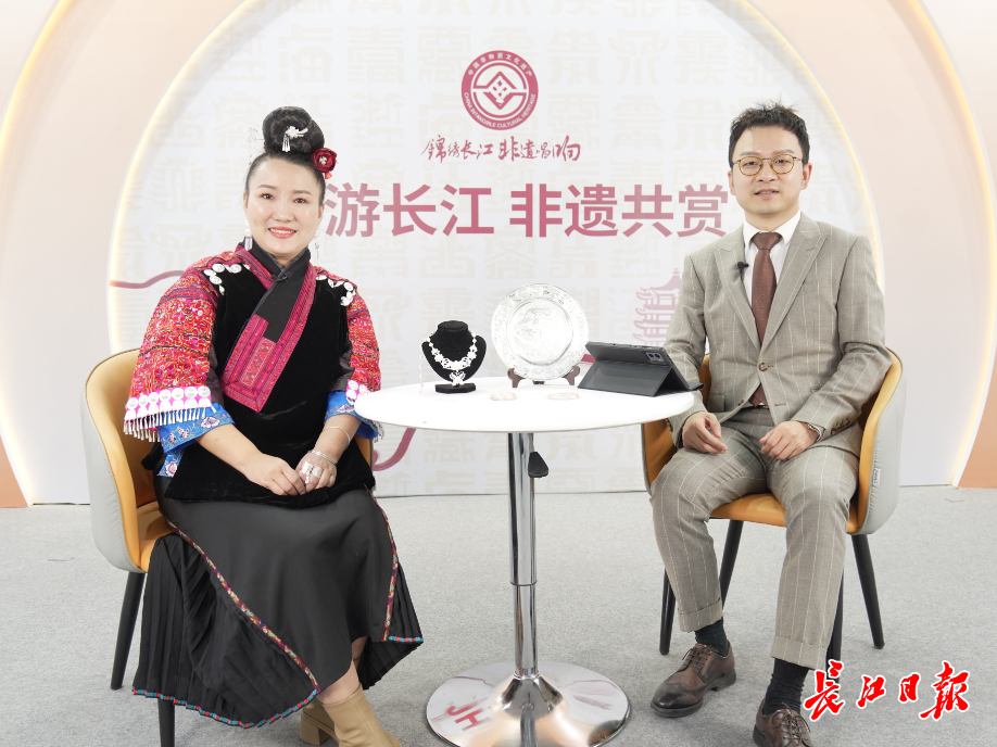 长江日报大武汉客户端10月26日讯(记者黄丽娟)一套完整的苗族嫁妆包括头帽、手镯、项圈、脚钏等银饰,一整套重达十几斤,价格在几万到几十万元之间。每逢盛大节日或亲朋好友到来,姑娘们就会戴上银饰盛装出席,载歌载舞以示欢迎和庆祝。10月26日下午,贵州省苗族银饰锻造技艺传承人吴春秀身着隆重的苗族盛装,做客长江日报“云游长江 非遗共赏”直播间时表示,苗族女孩的嫁妆从出生时就开始筹备,每一件银饰都是苗族文化传承的瑰宝。