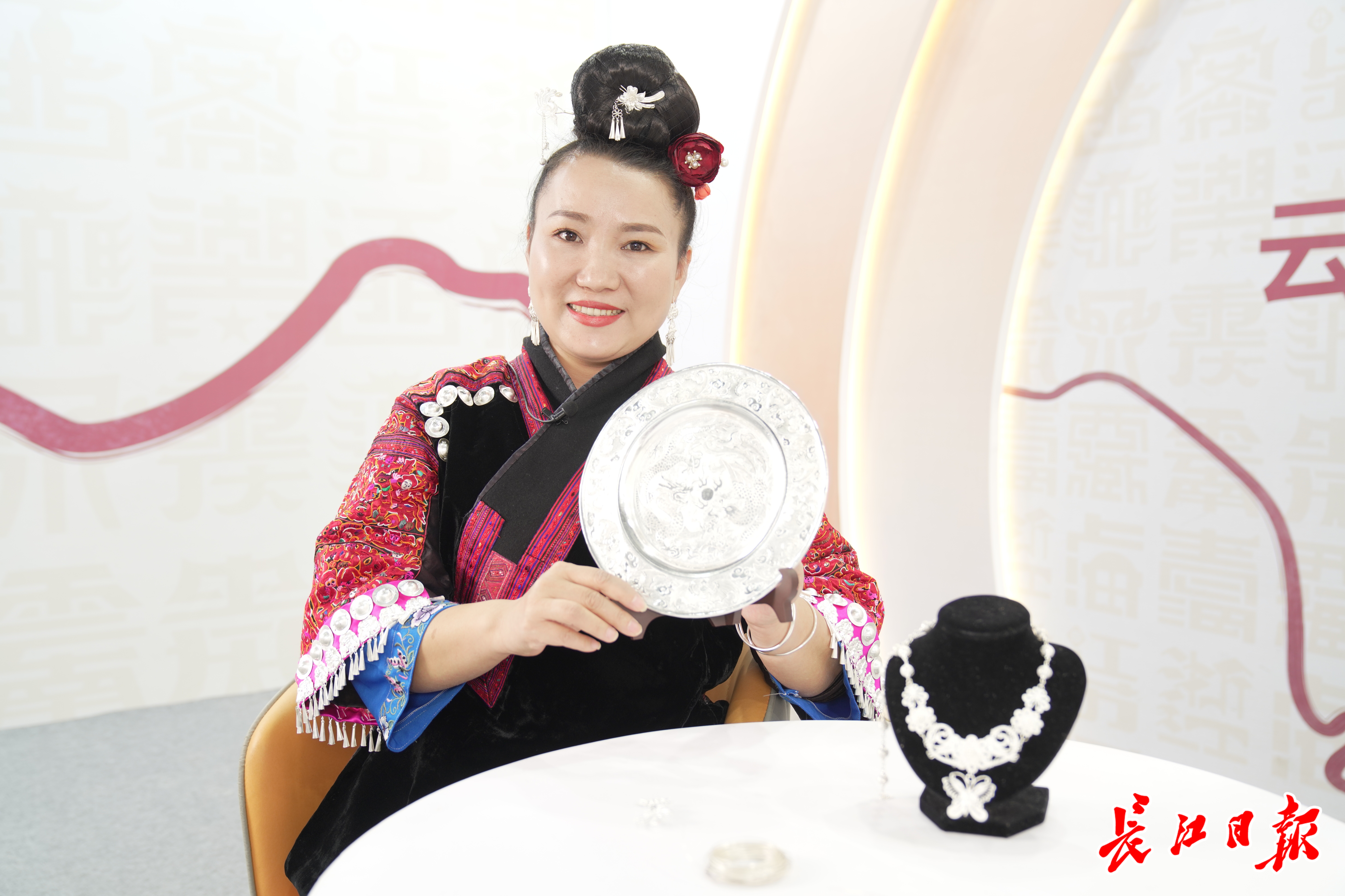 贵州省苗族银饰锻造技艺传承人吴春秀做客直播间。陈启 摄