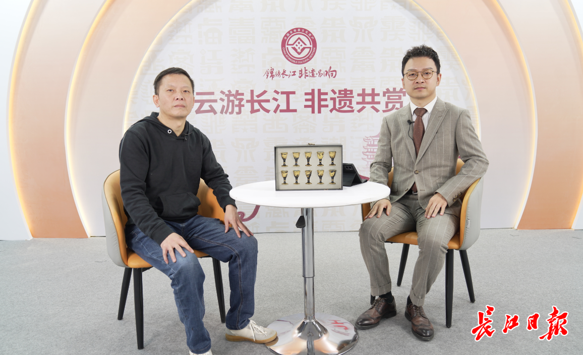 在直播间,占彬带来一套自己精心打磨的龙年酒具,有10个小酒杯。“这款杯子是我在即兴的状况下,做得最好的一款陶瓷酒杯。”他介绍,这套酒具采取了传统的陶瓷雕刻技艺,每个被子底面是全手工绘画。杯底的黑色与杯面的金色相互映衬,展示出富丽堂皇之感。“酒杯越小,对工艺的要求越高,比如杯面上的龙头、龙神、龙眼,一刀定位下去非常考验用刀的准确度,所有的造型都要精准无误。”
