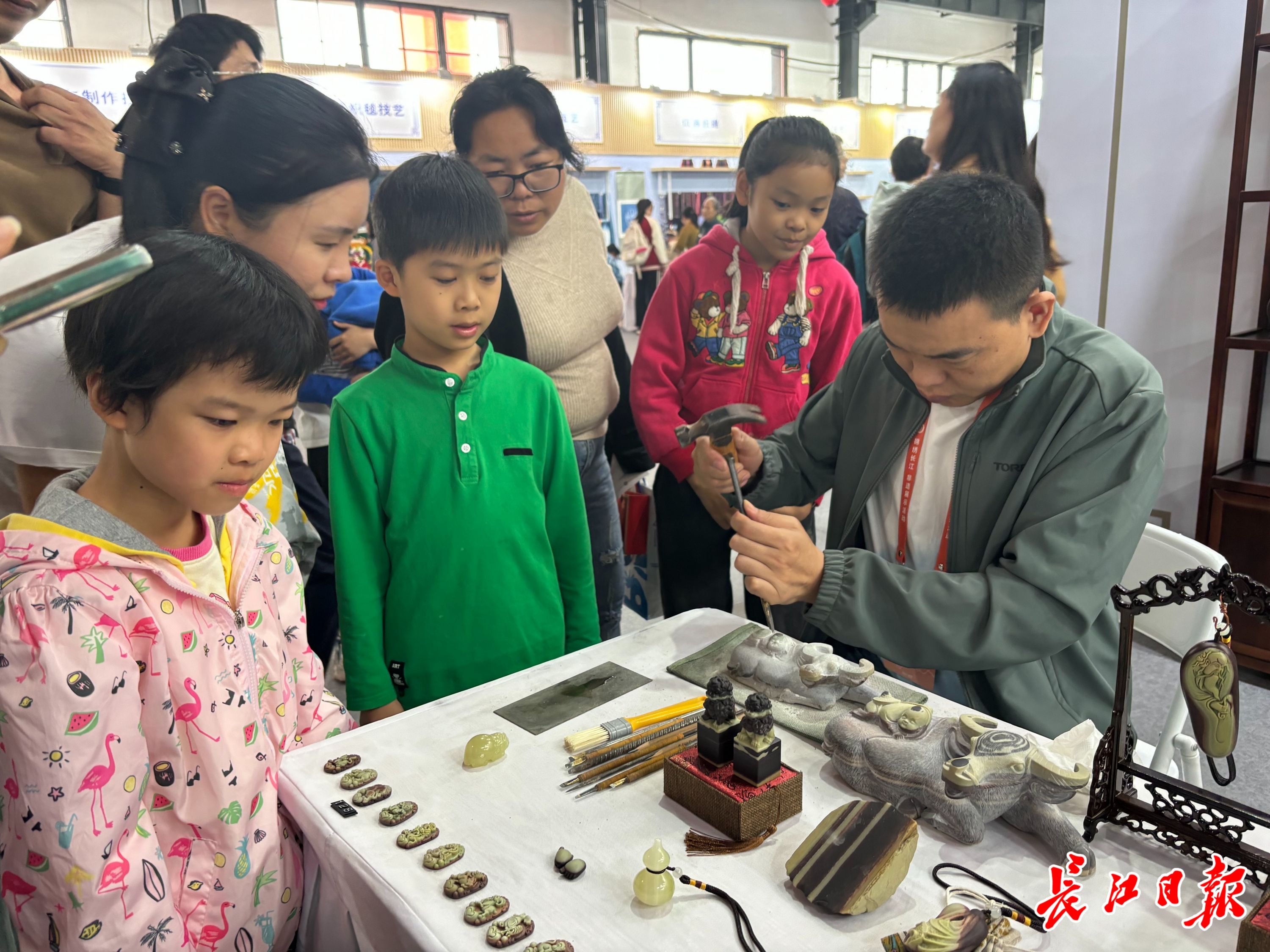 重庆大石足雕传承人杨准现场“凿”牛,围观的孩子看得目不转睛,“这个雕牛的工具好多啊!”杭州玉石雕刻传承人李浩让市民用手机拍摄作品上的字放大观看,“这些字只有0.03毫米,只有在非常安静的状态下才能进行雕刻”。