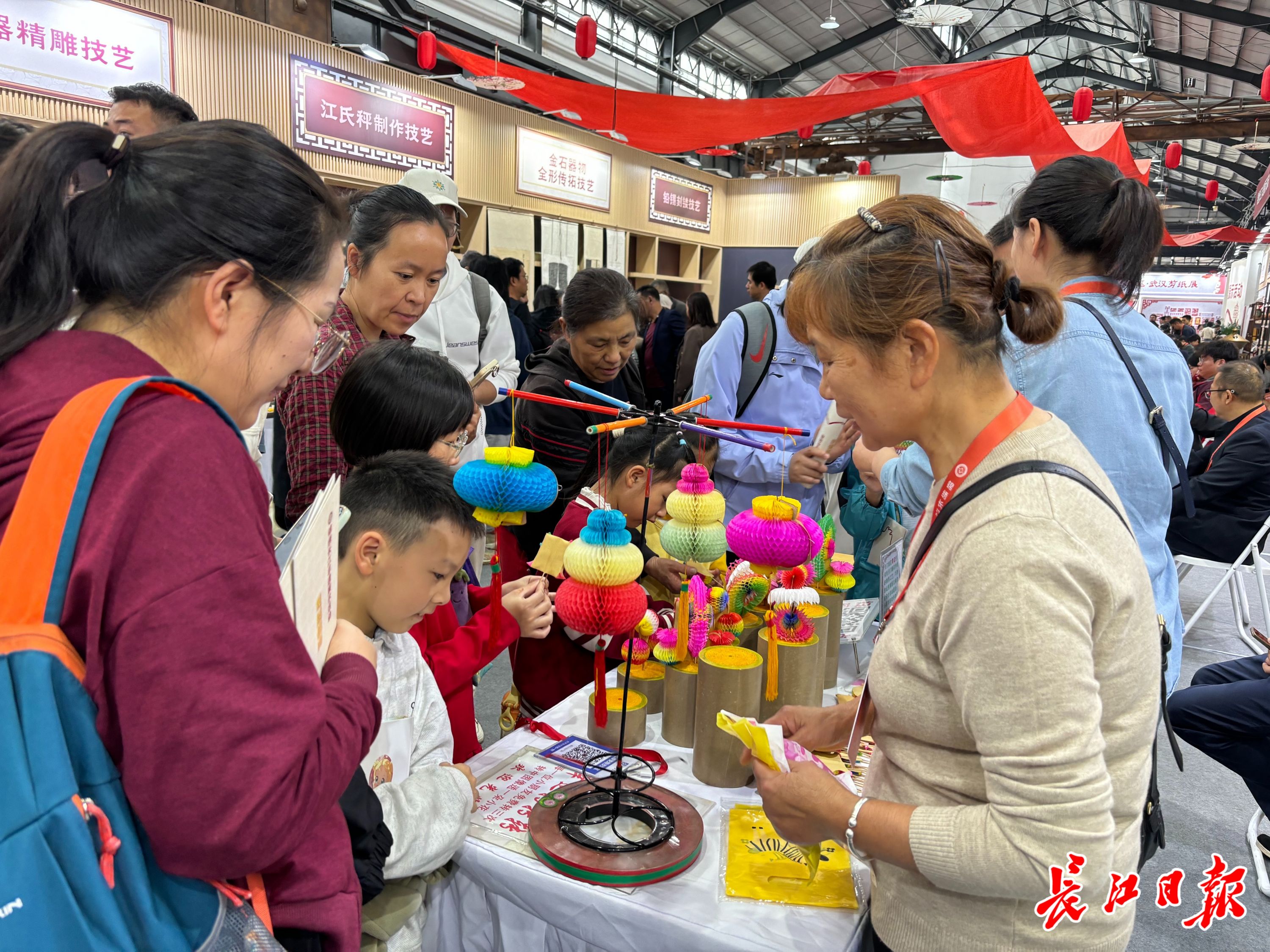 蕲春艾灸的艾灸贴、足贴、肚脐贴销售火爆。佤族织锦技艺市级传承人李宪兰带来的杯子、香包、手镯等,深受武汉市民欢迎。天门纸花的摊位前,围满了小朋友。有家长一口气买3个纸花,“一个纸花能变化出20多种图案,孩子在家里可以玩好久”。展示活动现场热闹非凡,交易的热度也持续增强。前来观展的市民纷纷下单,将非遗好物带回家。