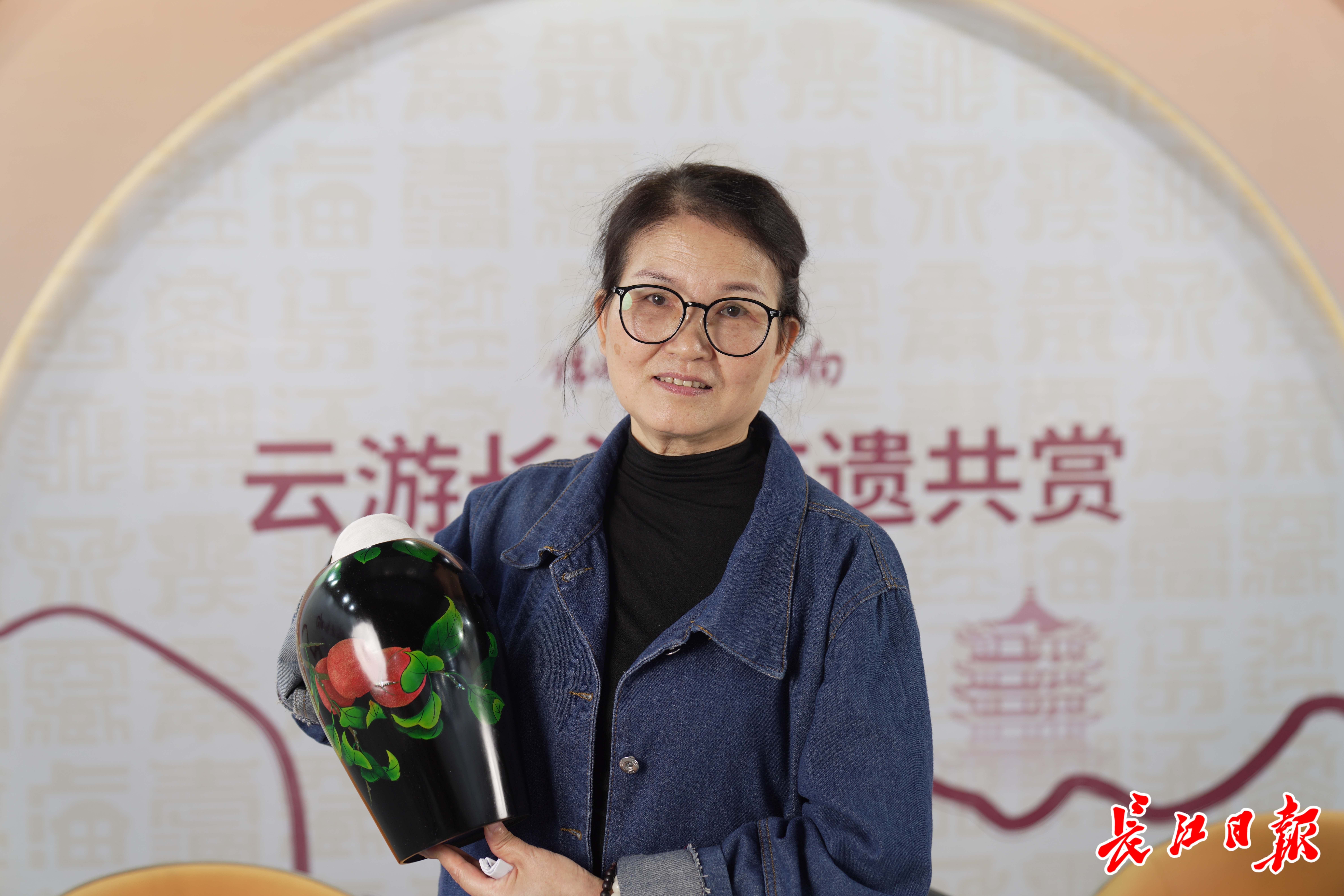 胡香维携带一只精美的脱胎漆器瓶来到直播间。她介绍说,来武汉共4次,这只漆器瓶是上次来武汉在长江边买的泥胎,回重庆花了半年上漆,再用银粉彩绘而成。记者看到,这只漆器瓶初看看不出来是陶泥瓶,通体透亮黑釉,其上有彩漆绘出的果树枝叶图,绿色叶片,成熟的桃子。