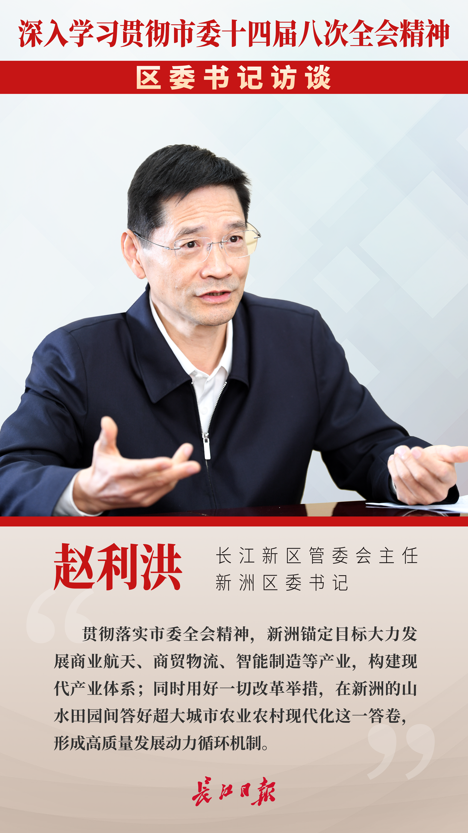 10月21日,长江新区管委会主任、新洲区委书记赵利洪接受长江日报记者专访时表示,贯彻落实市委全会精神,新洲将大力发展商业航天、商贸物流、智能制造等产业,构建现代化产业体系格局;同时动用一切可以动用的改革措施,在新洲的山水田园之上答好超大城市农业农村现代化这一答卷,形成高质量发展动力循环机制。