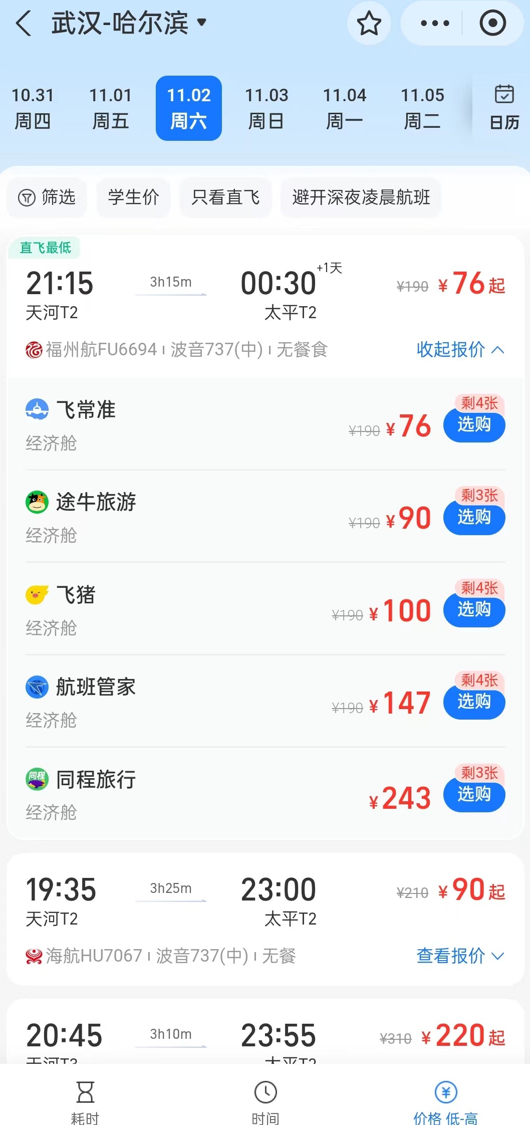 值得注意的是,低价机票往往出现在夜间和清晨时段,整体占比降低,随着时间的临近价格也会发生变化。另外,返程机票的价格一般会比去程高很多,比如哈尔滨近期飞往武汉的机票价格,普遍在400元以上,因此市民在出行前需要做好规划。