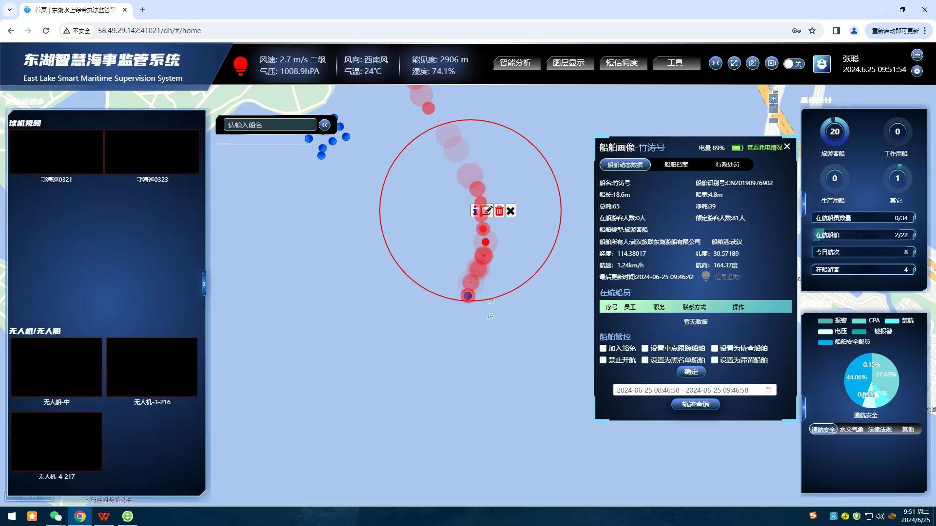 长江日报记者来到东湖风景区海事处智慧大厅,只见大屏上可见东湖水面详细情况,包括游船、执法船只航行轨迹实时跟踪、船舶游客数量实时统计、执法人员的实时位置和执法全过程等。东湖风景区海事处工作人员介绍,该平台基于5G和物联网等技术,借助多元传感器,通过趸船+雷达+无人机+巡逻船+岸基摄像头等硬件设备,实现了东湖重点水域7×24小时实时监控及巡湖智能化。