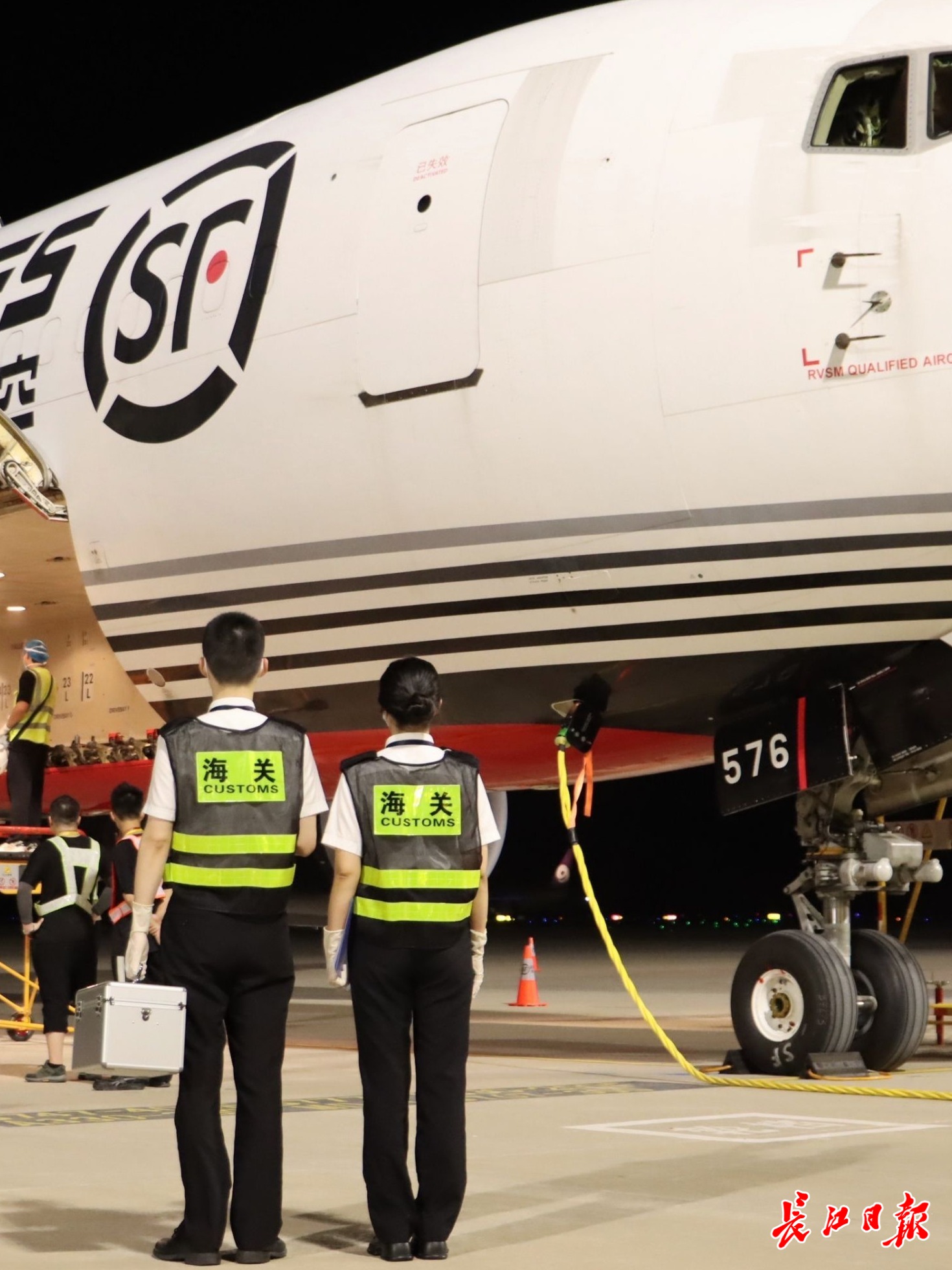 武汉海关关员对鄂州花湖国际机场国际货运航班进行现场监管。