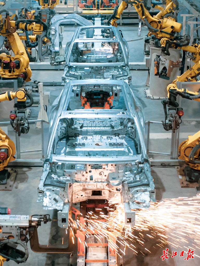 凌晨3时,岚图工厂却依然是车声“隆隆”、灯火通明。“嗞嗞”的焊接声中,这些“钢铁侠”挥动手臂、旋转腾挪,几名工作人员正穿着阻燃长袖工装来回走动,关注着生产线上的设备运转。