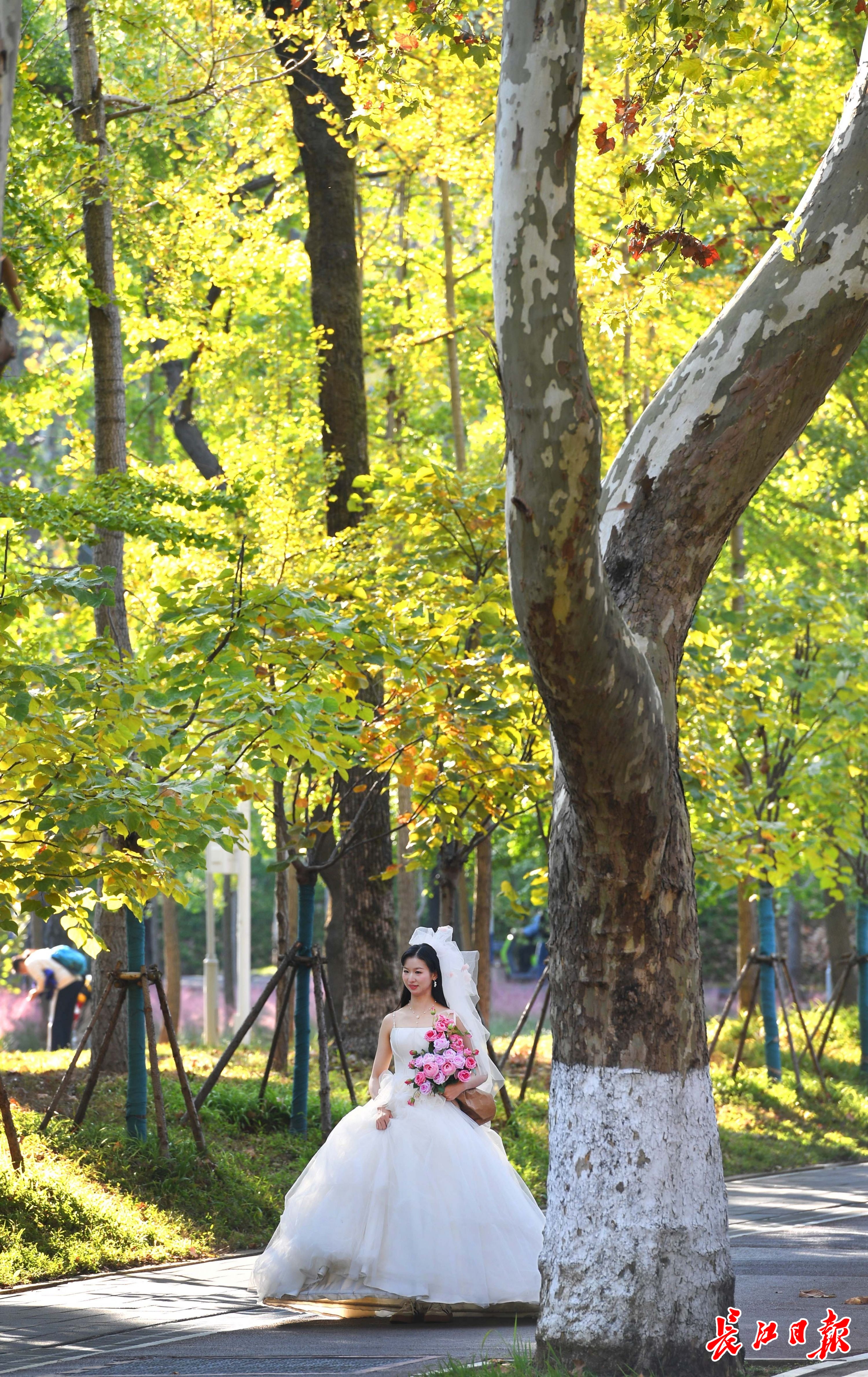 在金色鹅梧桐树大道上拍摄婚纱照,留下人生最美的风景。 记者高勇 摄
