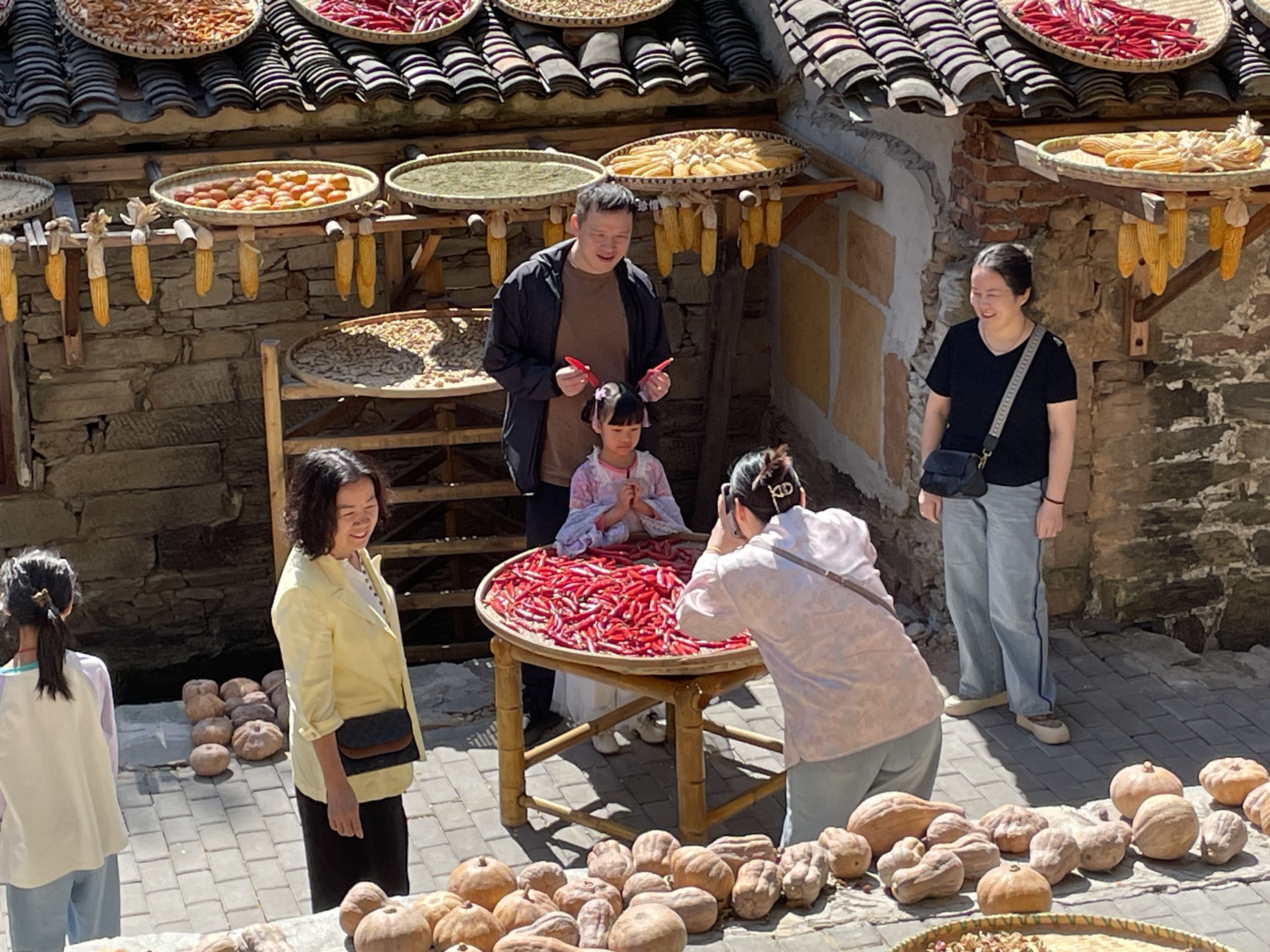 在大余湾,晒秋节展示一个既传统又充满创意的秋日庆典。古朴的青石板街道旁,金灿灿的玉米挂在树间,圆润饱满的南瓜堆成山。房前屋后挂满了红辣椒、火柿子。越来越多的年轻人走进大余湾和村民一起收割,吃丰收宴、喝丰收酒,感受收获的喜悦。