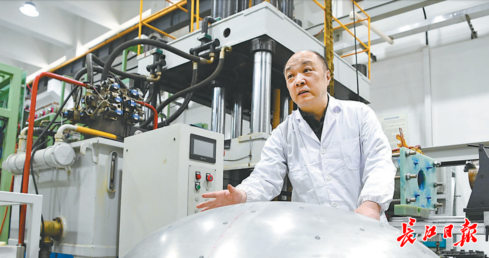 国家脉冲强磁场科学中心主任介绍电磁成型装备制造的壳体构件。 记者高勇 摄