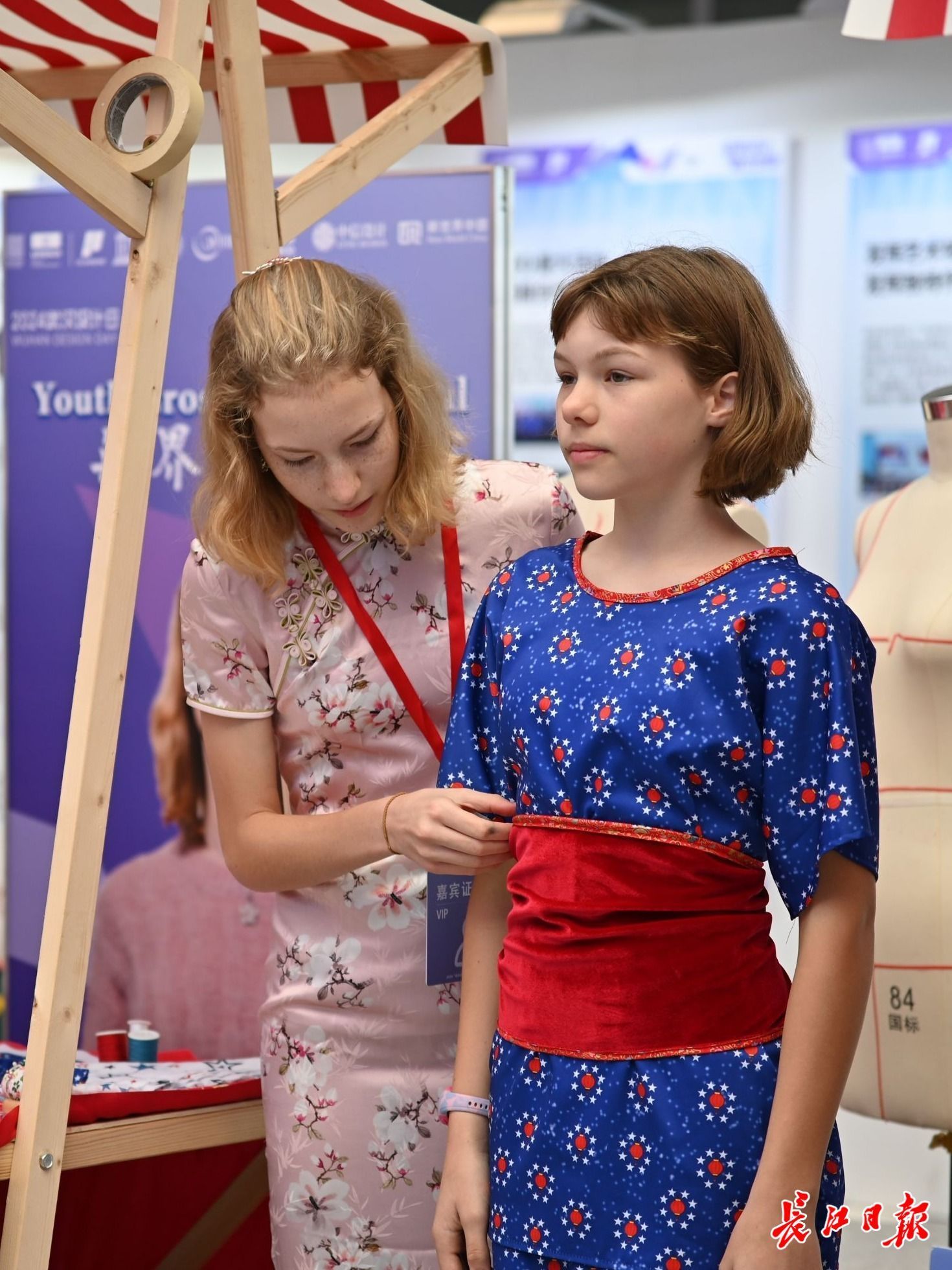 在汉生活了5年的美国女孩任雨霏展示她的服装作品。