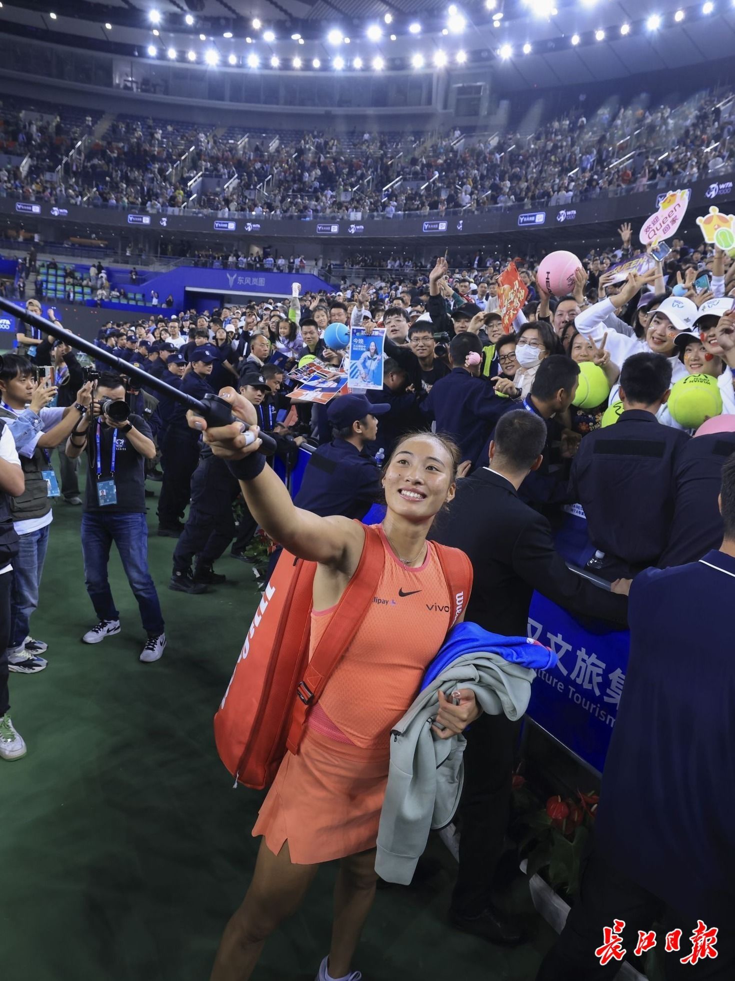 郑钦文取得2024武汉网球公开赛首胜后与球迷合影。长江日报记者 胡冬冬 摄