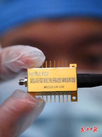工程师展示国内首款110GHz电光强度调制器。