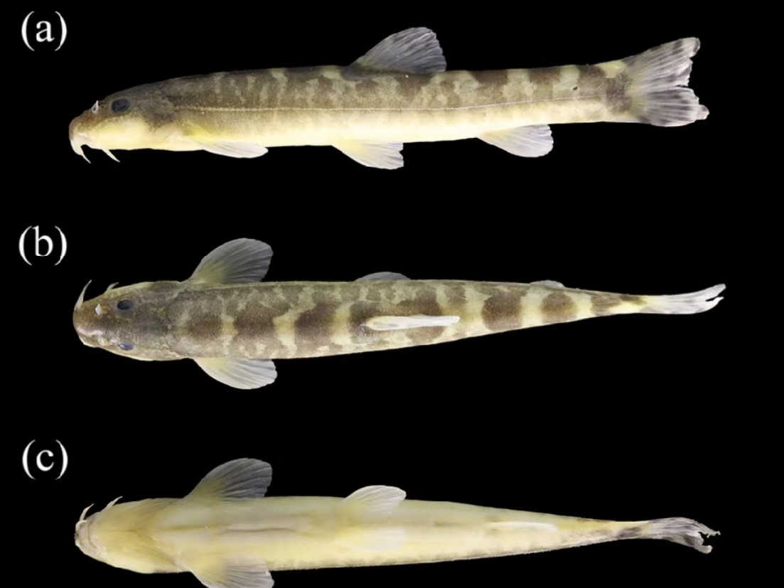 短须山鳅的(a)侧面照,(b)背面照和(c)腹面照。张楚依供图