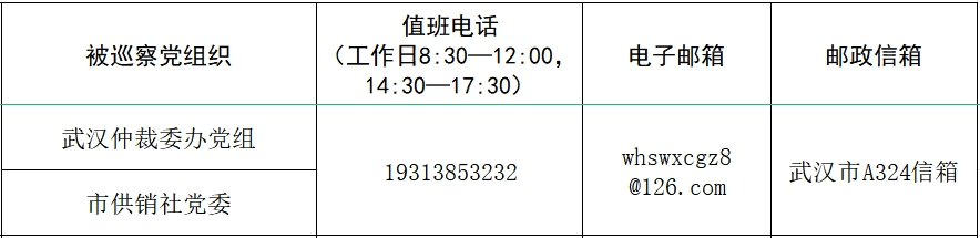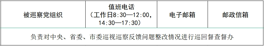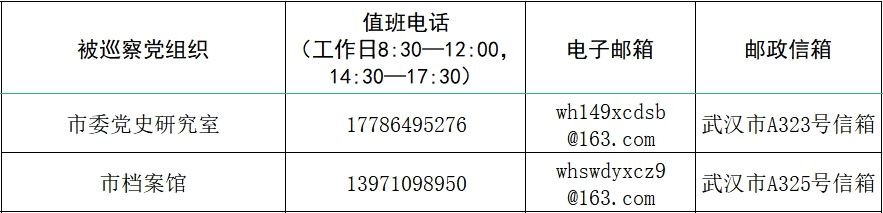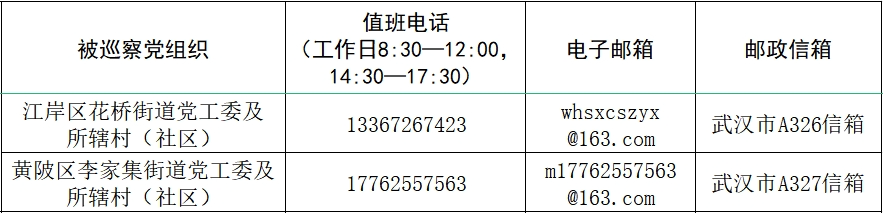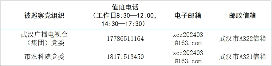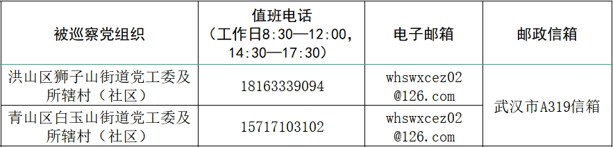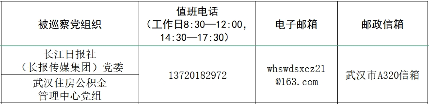 据悉,本轮巡察工作时间45天左右,其间设立专门值班电话、邮政信箱、电子邮箱和“荆楚码上巡”信访反映二维码,主要受理反映被巡察党组织领导班子及其成员、下一级党组织主要负责人和重要岗位人员问题的来信来电和举报反映。