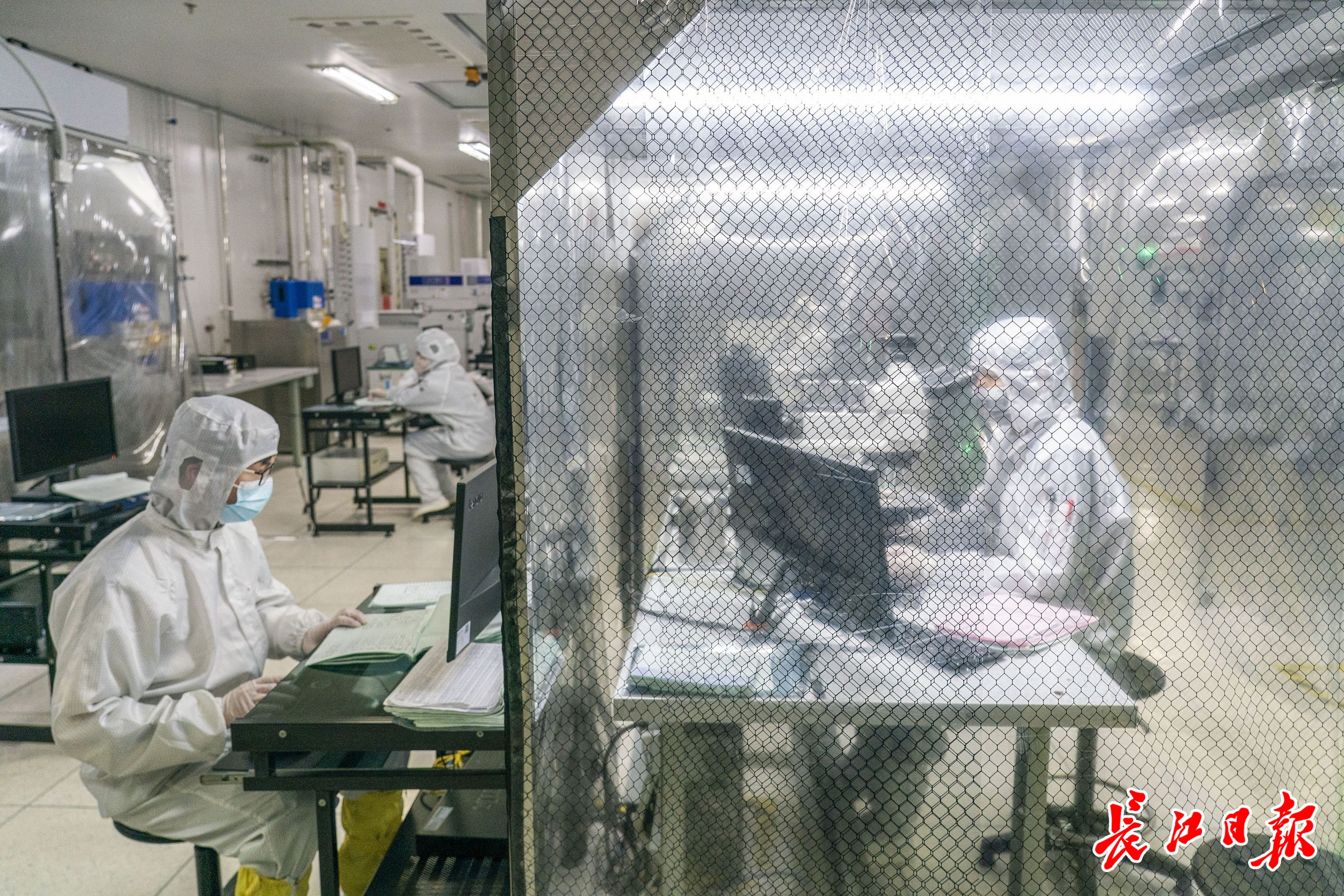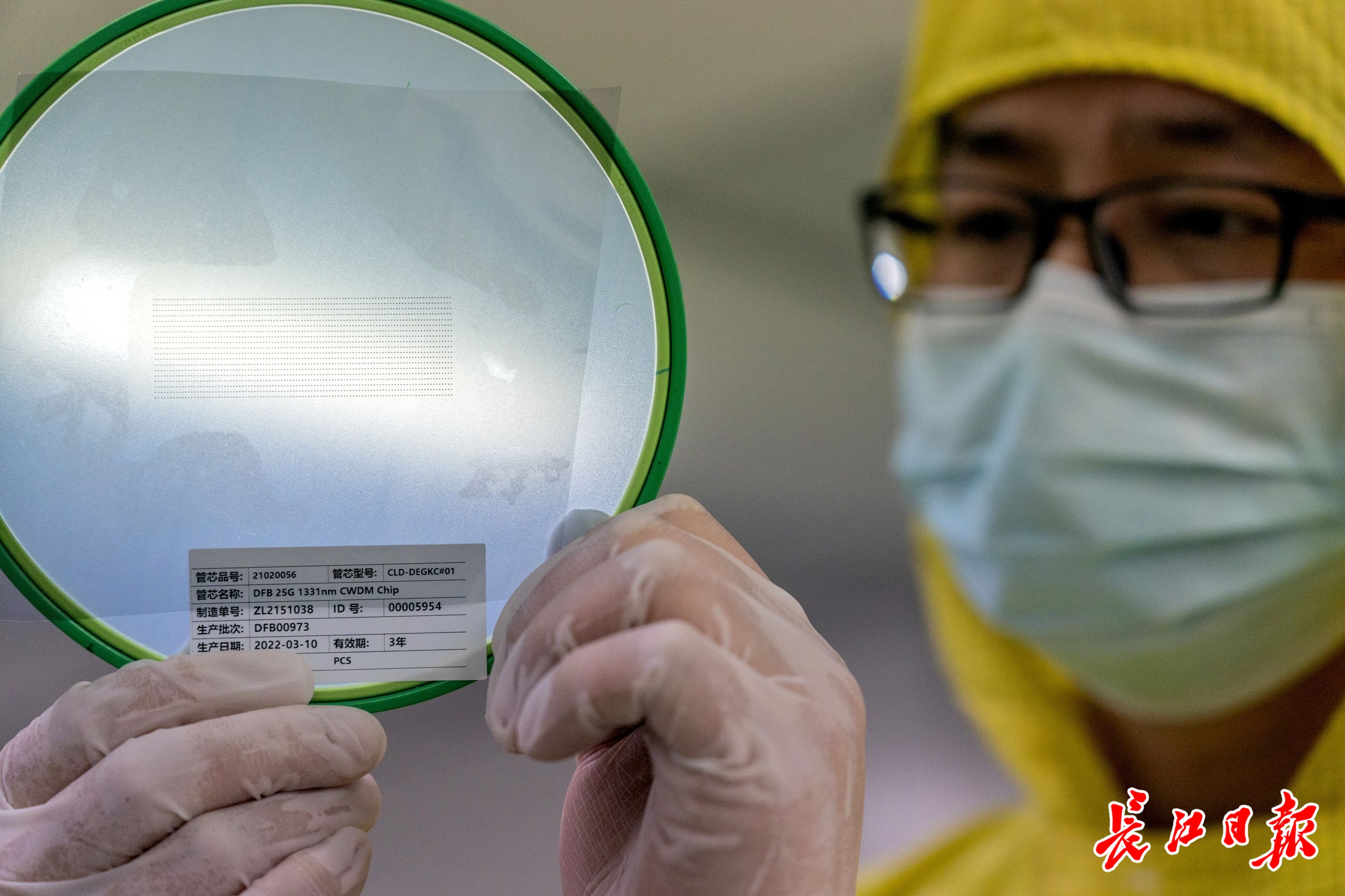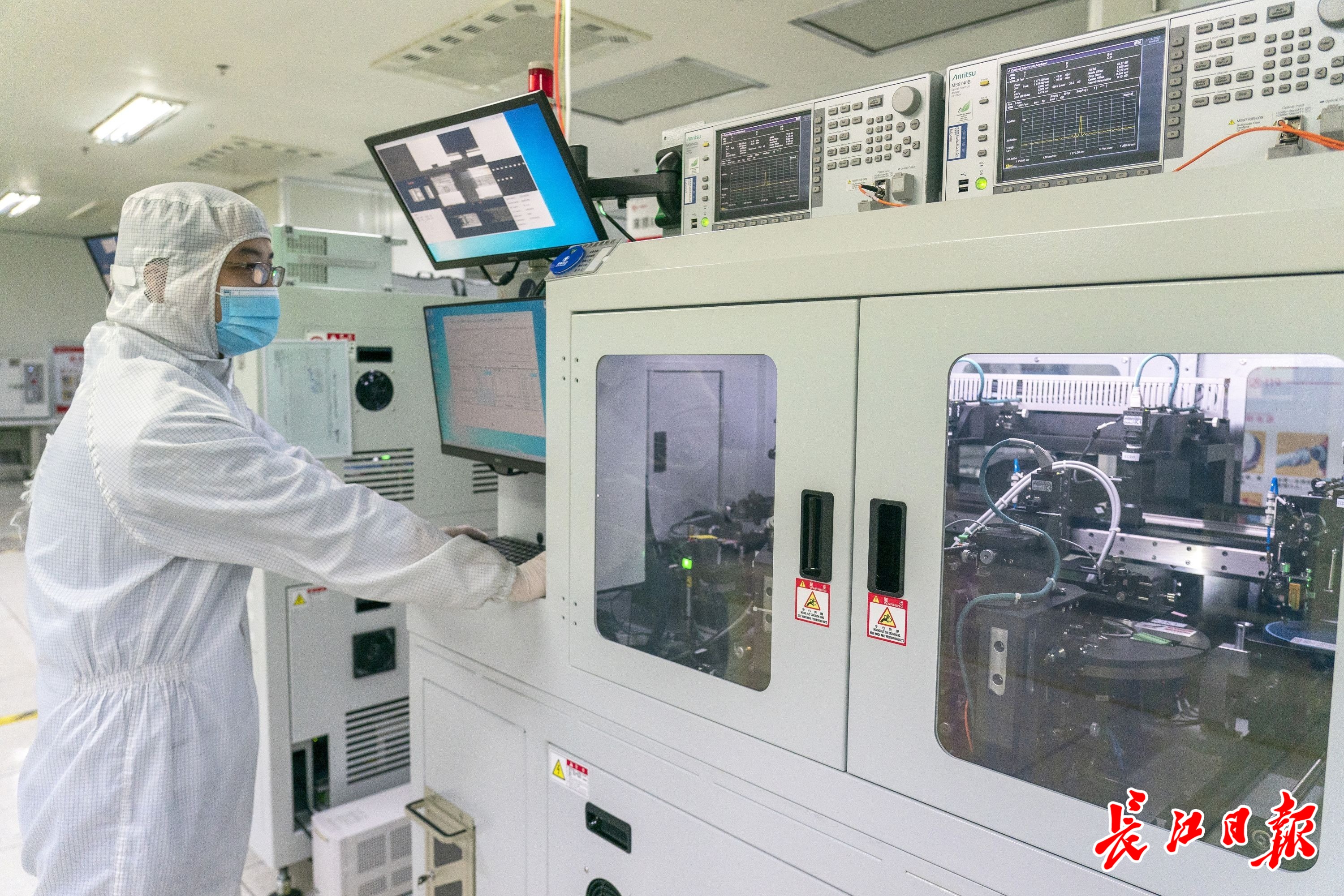 3月13日,长江日报记者在武汉云岭光电有限公司看到,4000余平方米的芯片无尘车间内,技术人员身着防尘服,正在生产芯片晶圆。
