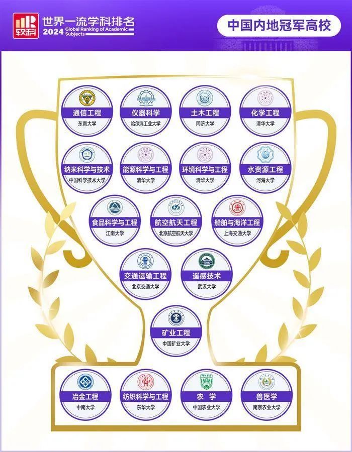 此次排名中,中国内地高校在18个学科成为全球冠军,分别是:清华大学(化学工程)、清华大学(能源科学与工程)、清华大学(环境科学与工程)、东南大学(通信工程)、哈尔滨工业大学(仪器科学)、同济大学(土木工程)、中国科学技术大学(纳米科学与技术)、河海大学(水资源工程)、江南大学(食品科学与工程)、北京航空航天大学(航空航天工程)、上海交通大学(船舶与海洋工程)、北京交通大学(交通运输工程)、武汉大学(遥感技术)、中国矿业大学(矿业工程)、中南大学(冶金工程)、东华大学(纺织科学与工程)、中国农业大学(农学)、南京农业大学(兽医学)。