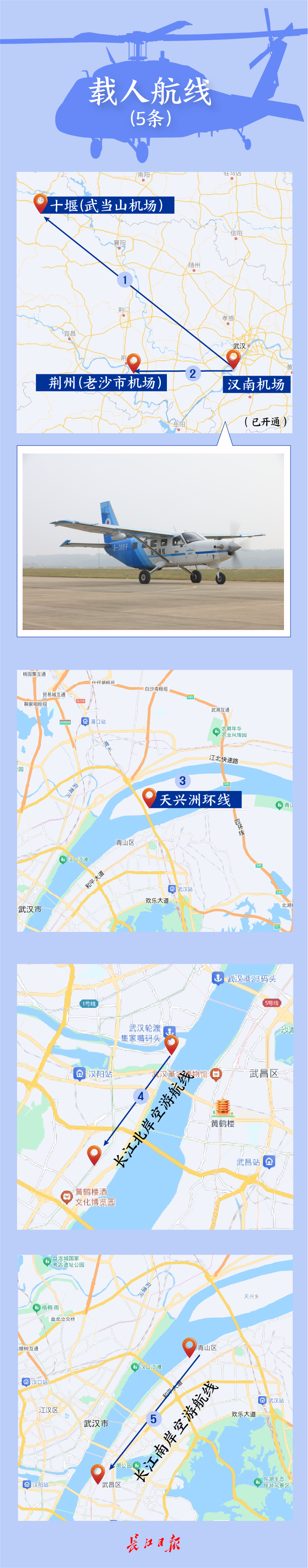 载人航线方面,汉南—十堰、汉南—荆州(老沙市机场)等2条低空短途客运航线已于前期开通。另外3条则以空中游览为主。其中南岸嘴-建港、青山江滩—中山路两条航线是游览两江四岸的旅游观光线,市民可以乘坐直升机,在空中感受武汉、长江的磅礴气势;位于天兴洲上的另一条航线也为空中游览线,机型动力悬挂滑翔机。