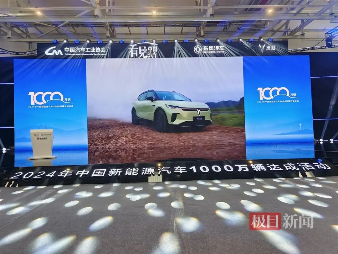 当天上午,在工业和信息化部指导下,由中国汽车工业协会主办、东风汽车集团有限公司(以下简称“东风汽车”)承办的2024年中国新能源汽车1000万辆达成活动在武汉举行。场外,十多家车企的新能源汽车同台亮相,背景板上写着“为用户造好车,我们都是中国队”。场内,国家部委及省市领导、专家学者、行业机构代表、车企代表等齐聚一堂,共同见证这一历史性时刻。