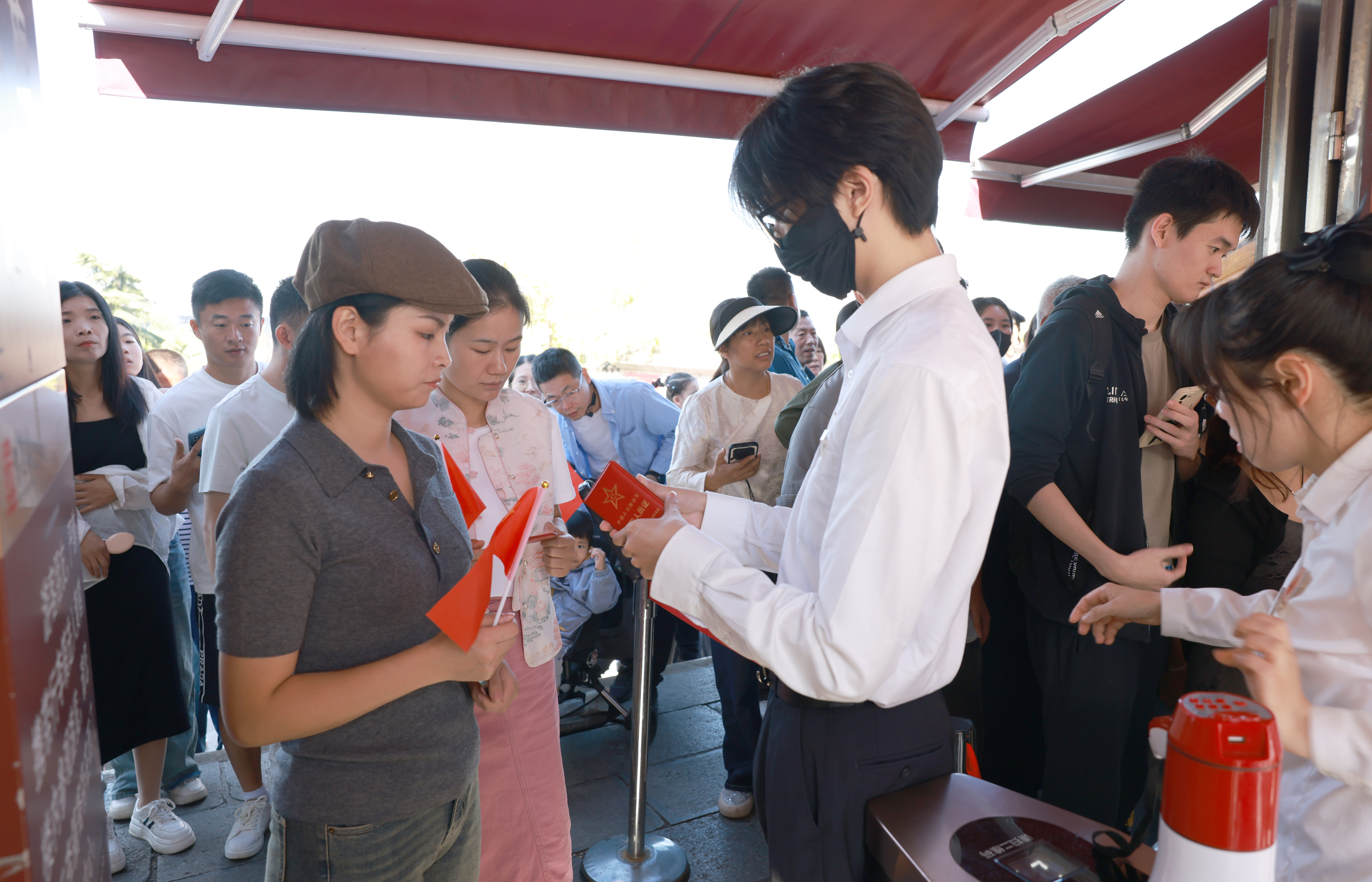 黄鹤楼公园工作人员查验文职人员证件,给其提供免费入园服务。 通讯员白宗强 摄