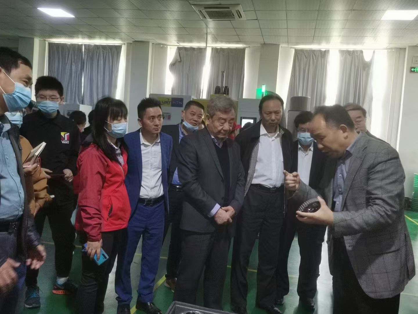 余运清(右一)正手持减速机向访客介绍产品性能。受访者供图