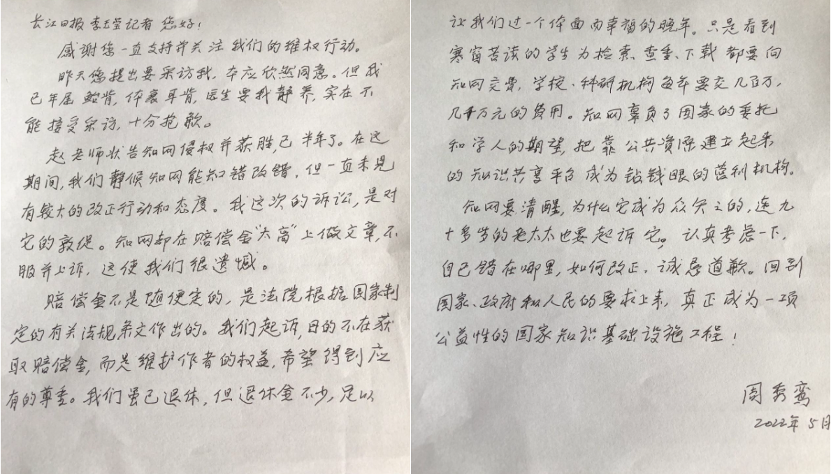 老人后来专门给记者写了一封信,谈了因身体原因不能接受采访,同时也讲述了起诉知网的初衷:目的不在获取赔偿金,而是维护作者的权益,希望得到应有的尊重。信中,这位当时将迎来94岁生日的老教授客气地称“90后”的记者为“您”。