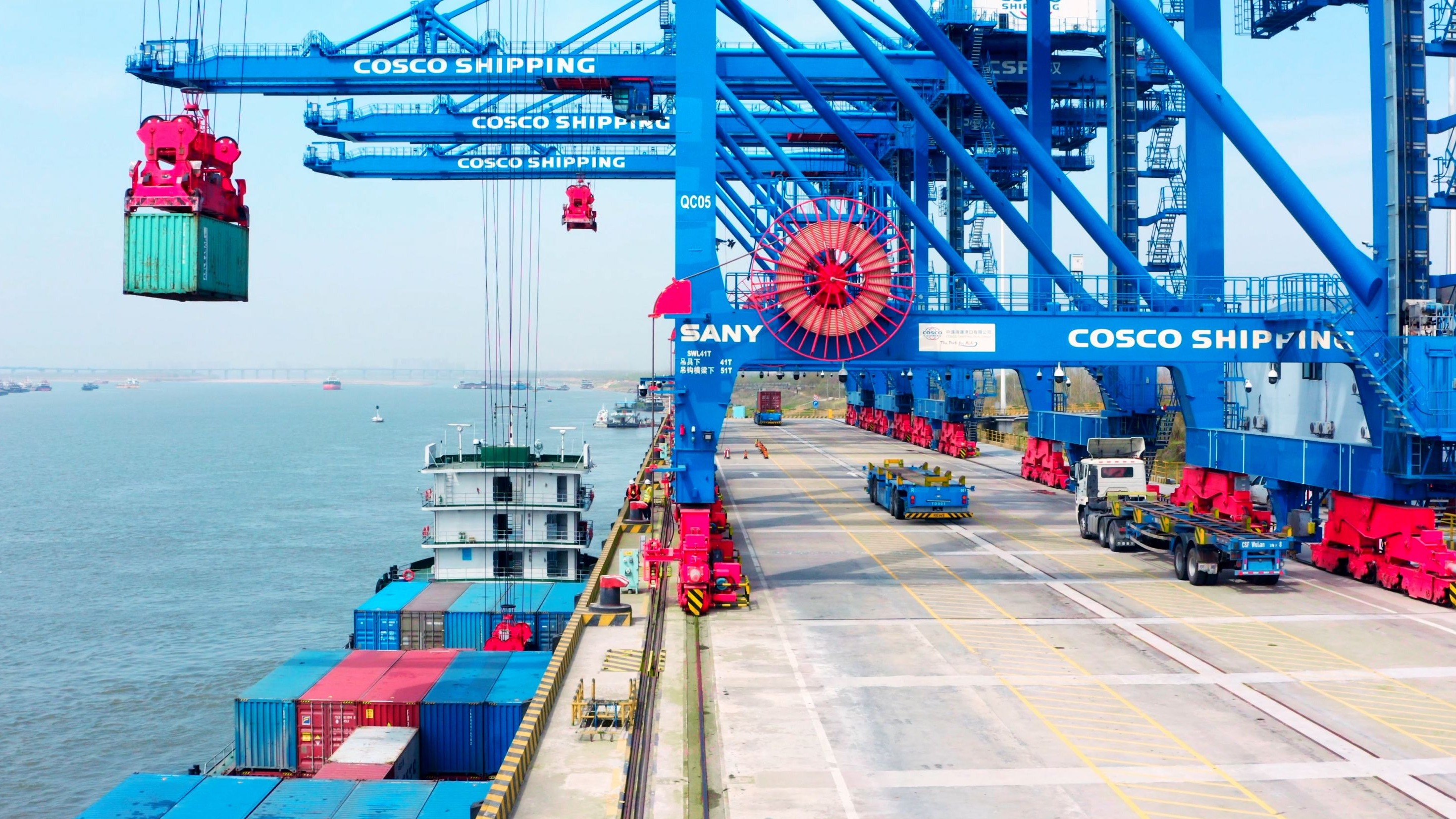 武汉中远海运码头岸桥正在进行集装箱装卸作业。通讯员供图