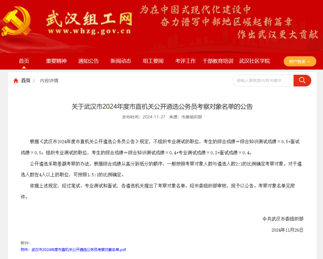 关于武汉市2024年度市直机关公开遴选公务员考察对象名单的公告