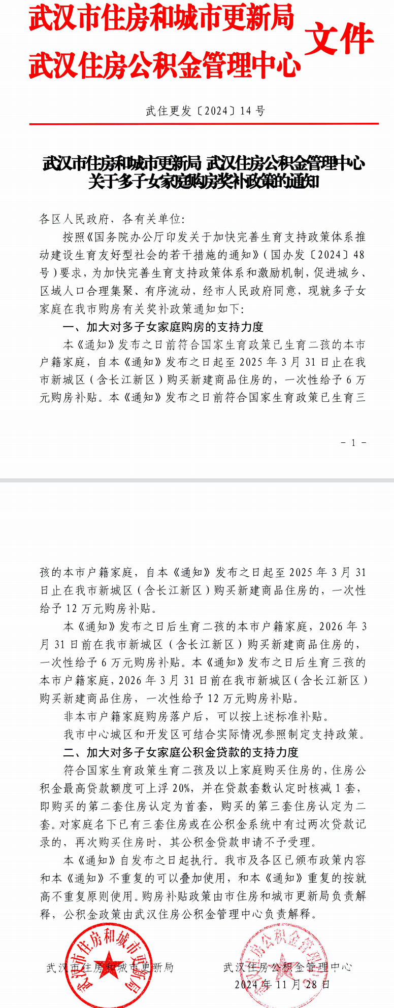 11月29日,为加快完善生育支持政策体系和激励机制,促进城乡、区域人口合理集聚、有序流动,湖北省武汉市住房和城市更新局和武汉住房公积金管理中心联合发布《关于多子女家庭购房奖补政策的通知》(以下简称《通知》)。