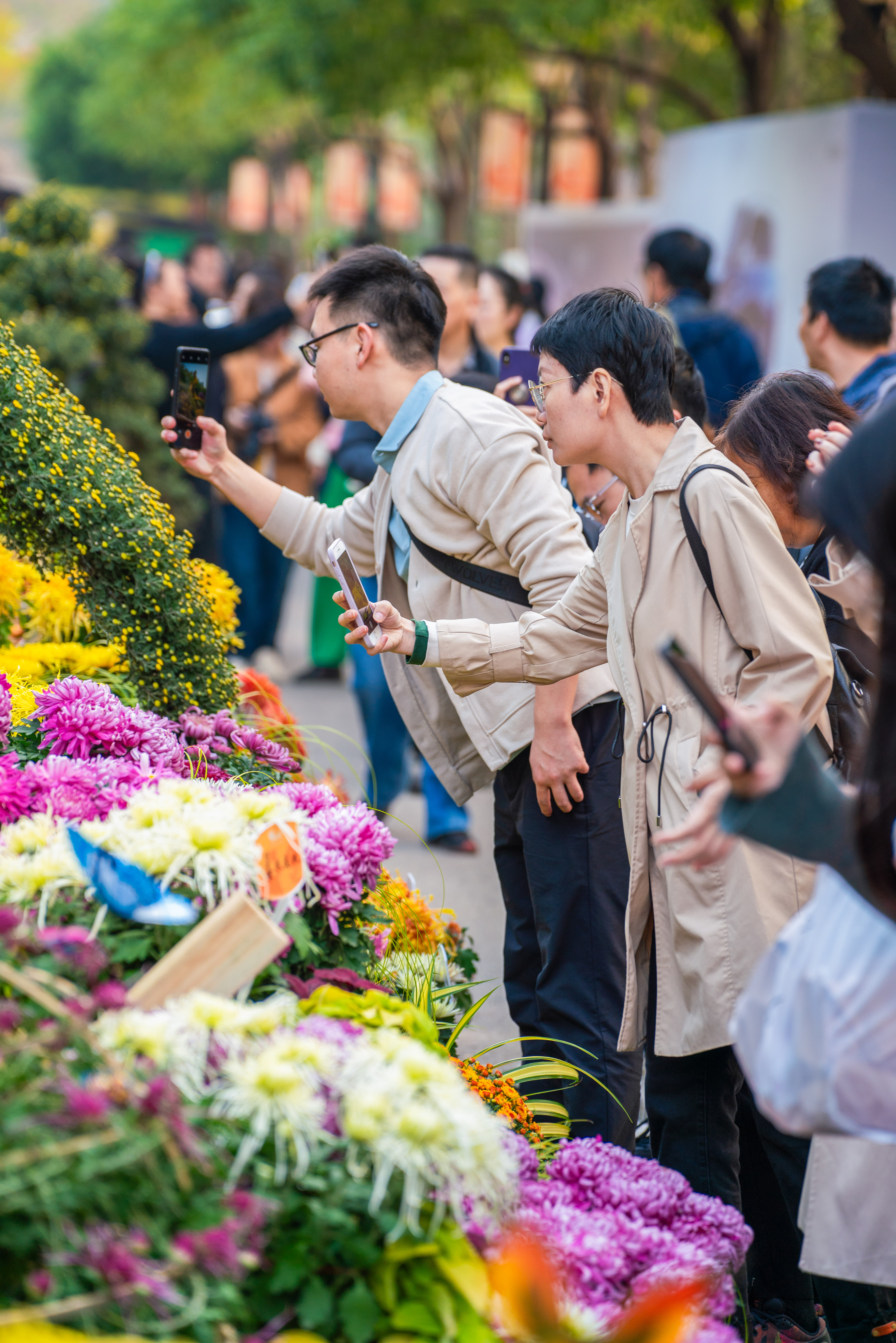 “菊花+经济+旅游+文化”等多面融合,群策群力、共同缔造等也是本届菊展的主要亮点。据统计,全市累计有130余家单位合力布展,除了公园绿地,全市18个展区之中,不乏布在商圈、景区、农场、交通枢纽地带的。3个主展区及近10个分展区设置了菊花市集,集中销售绿植花卉、生态产品、文创周边等。市民游客在赏菊的同时,还能漫步、露营、品茶、看车、逛街、赶集……