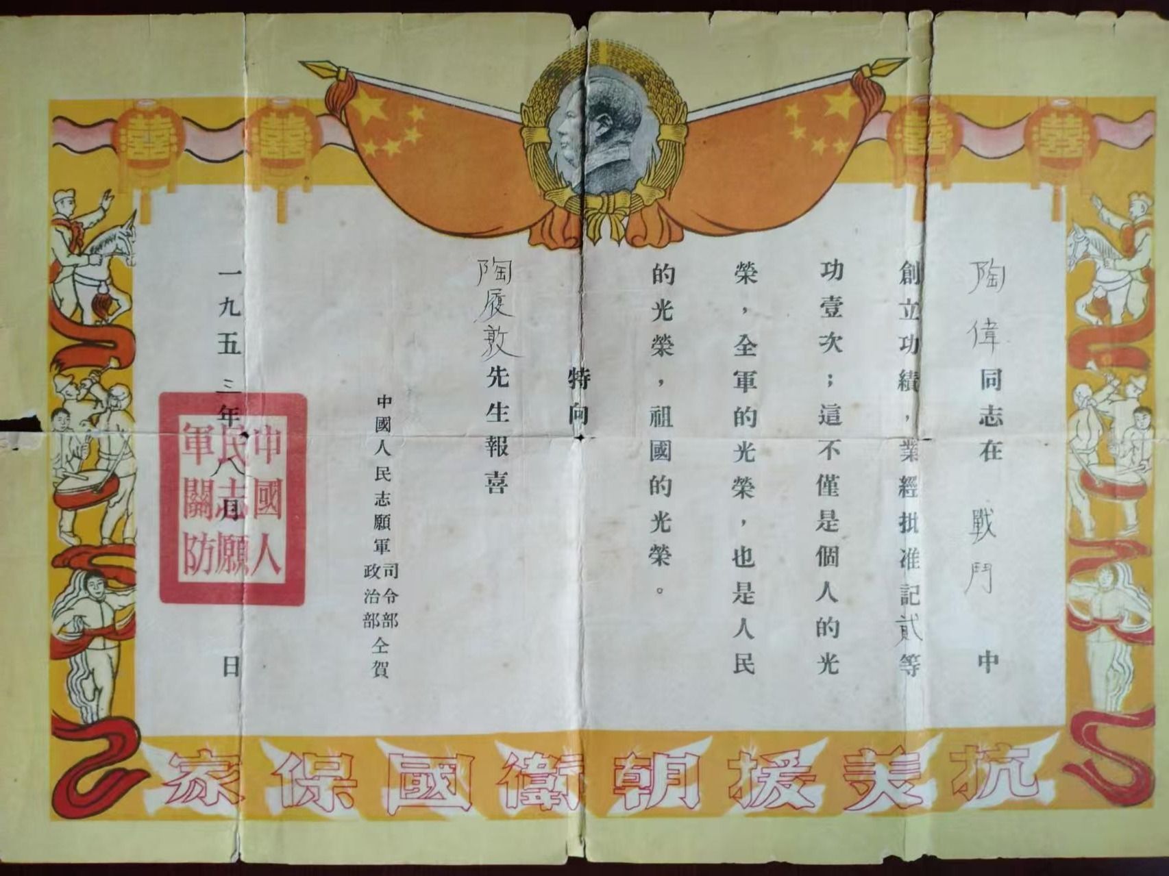 1953年,志愿军司令部给陶伟父亲寄送的陶伟立功喜报。图片均为陶伟老人提供