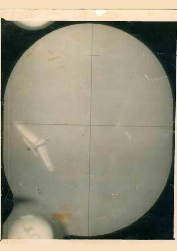 陶伟所驾战机开炮瞬间,机上照相机拍下的胶片,胶片中左下是目标敌机。经测算,陶伟战机当时距离敌机只有120米,创造了极限近距离击落敌机的纪录。