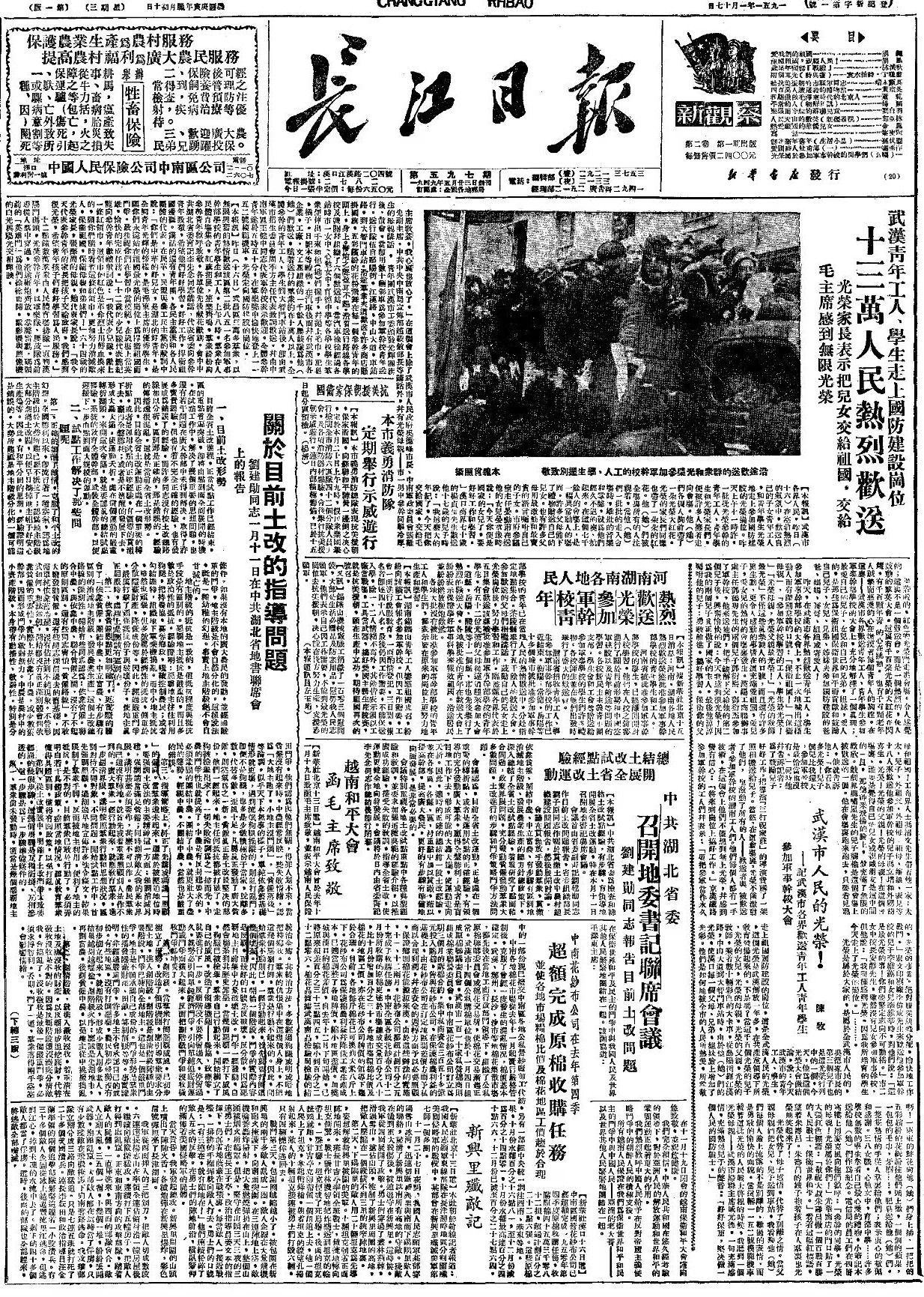 志愿军飞行员陶伟从武汉出发参军照片登上当年《长江日报》