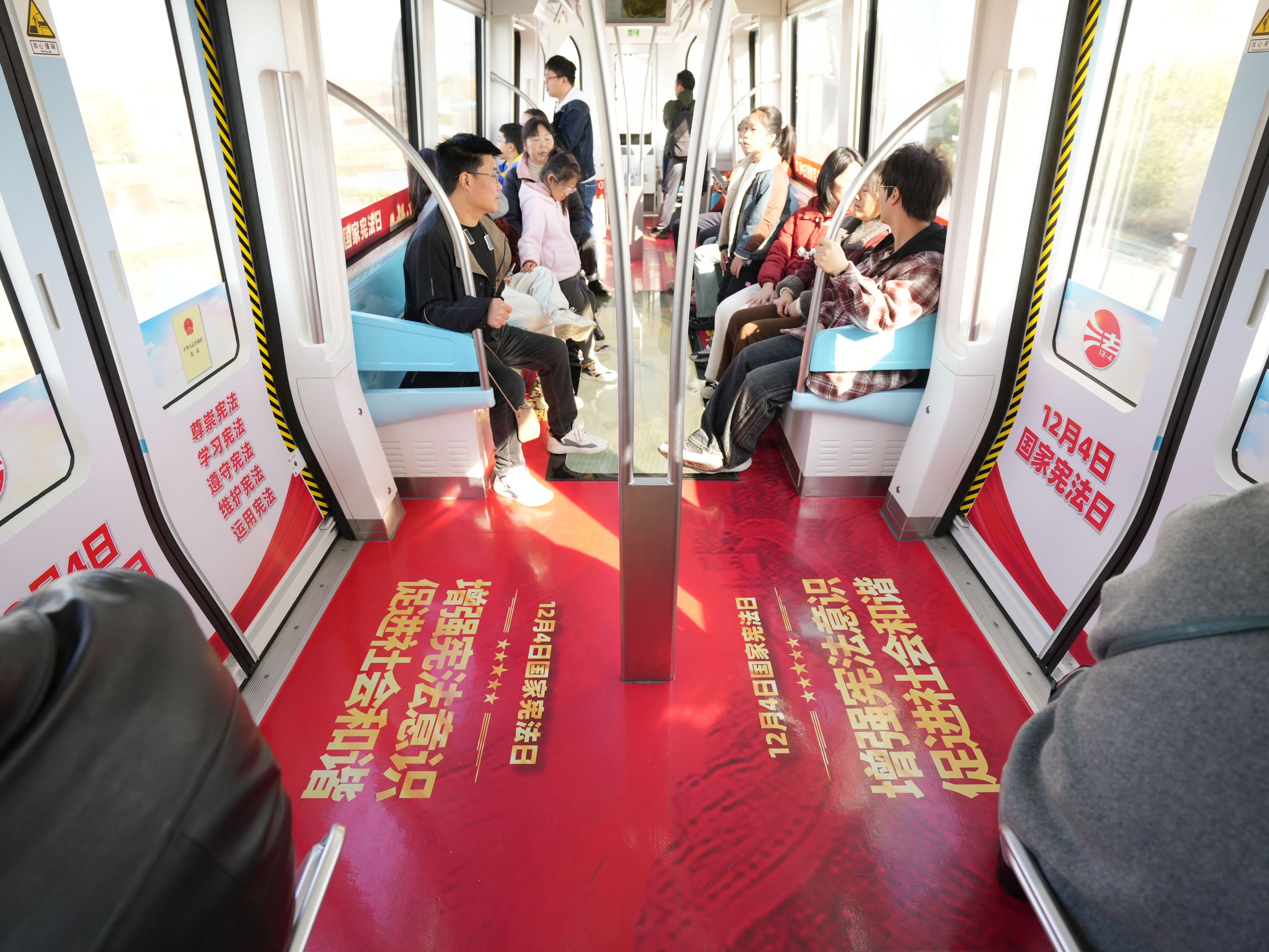 这辆光谷法治号空轨列车外面是红蓝配色,“12月4日国家宪法日”几个字异常醒目,站在路面也能看得很清楚。走进车厢内部,乘客可以看到红色的地面上书写着“增强宪法意识 促进社会和谐”字样,车门上写着“尊崇宪法 学习宪法 遵守宪法 维护宪法 运用宪法”。