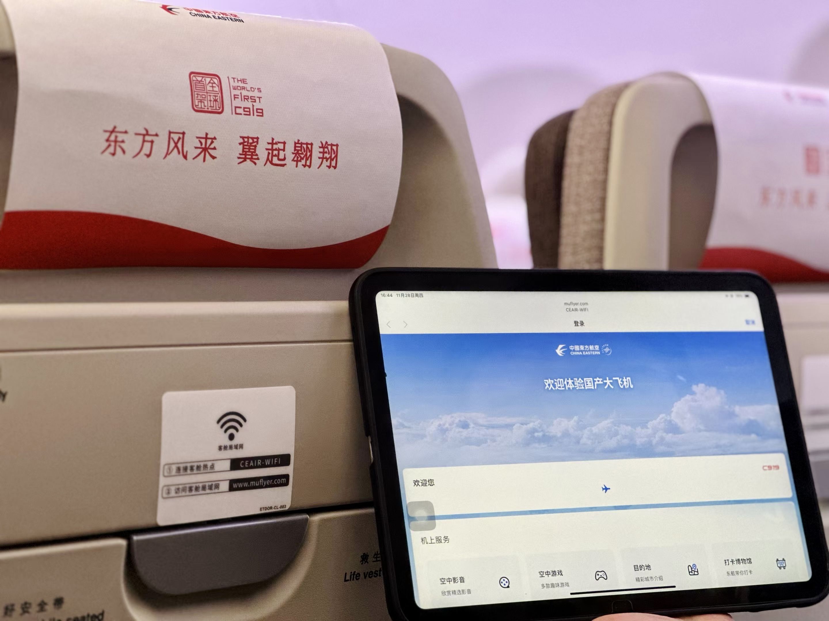 4日上午,长江日报记者登上这架C919飞机客舱看到,每个座椅都有“客舱局域网”提示标签,能够为旅客提供更加丰富的机上娱乐体验。旅客可通过具有WiFi功能的移动个人电子设备,在开启飞行模式后,进入局域网平台,搜索并连接无线局域网热点“CEAIR-WiFi”,即可进入局域网平台。