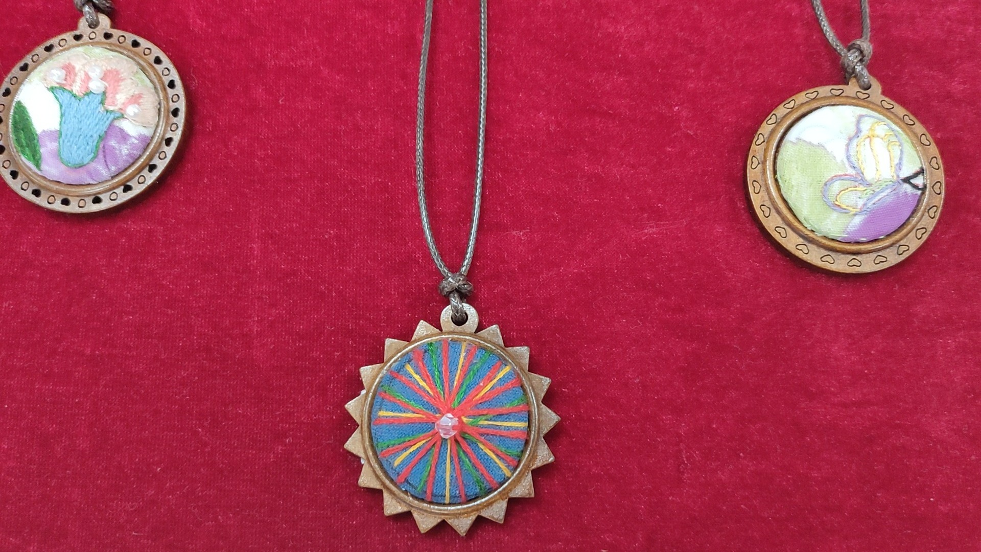今年12月,巴衣尔和同学们在课堂上制作的汉绣纹样工艺品。