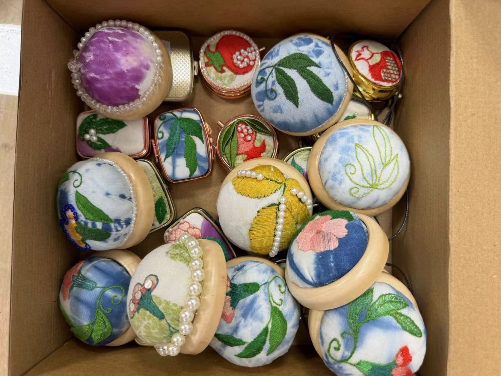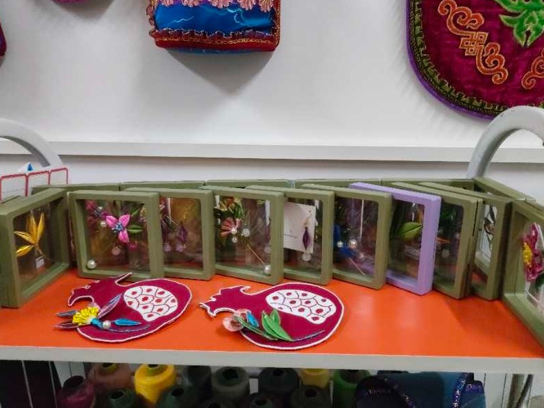 如今,巴衣尔工作室的货架上多了一个“荆楚非遗专区”,陈列着她亲手制作的汉绣项链、缠花胸针和阳新布贴首饰袋,在一众蒙古族特色工艺品的围绕下别具一格。